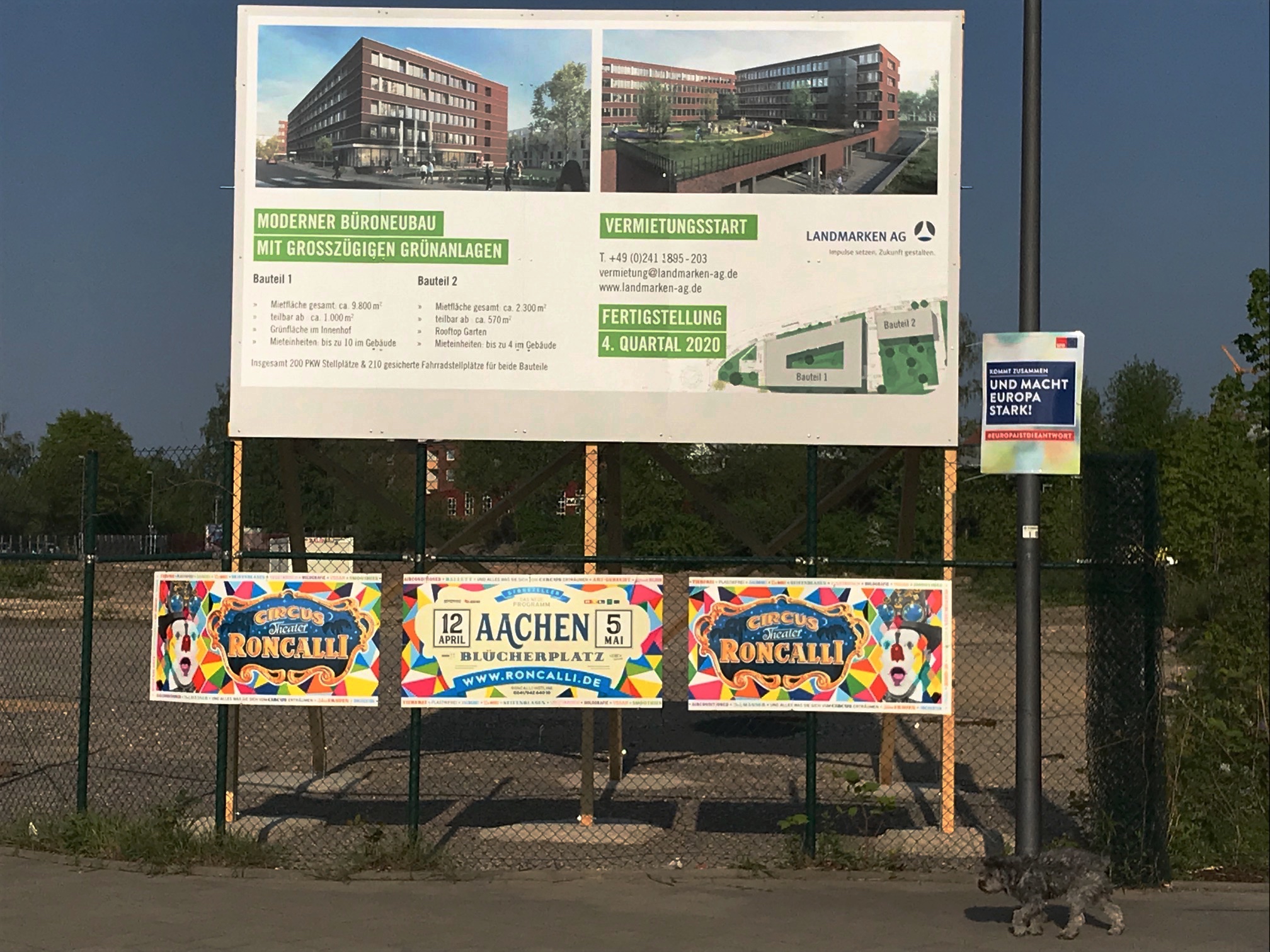 Hinter den Aachen Arkaden, am Eisenbahnweg, erstaunlich nah an den Schienen der Bahn, baut das Unternehmen eines Aachener Großinvestors, die Landmarken AG, zwei Bürogebäude, bzw eine Anlage in zwei Teilen. Das ist dem oben abgebildeten Hinweisschild zu entnehmen. Das Quartier „Guter Freund“ befindet sich in unmittelbarer Nachbarschaft.