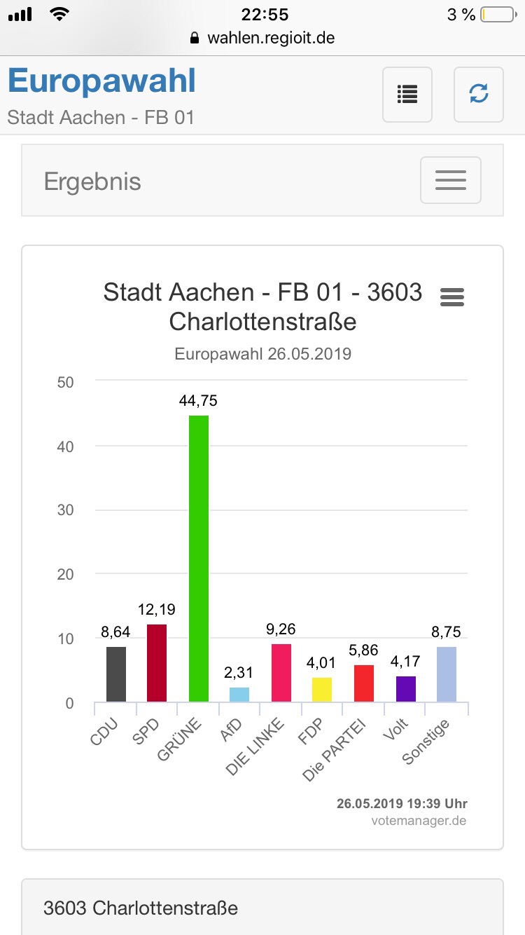 Die Schlacht ist geschlagen. Ich gratuliere den Grünen und den Spaßvögeln von Die Partei und auch Volt, ihr habt in Aachen sehr viele Stimmen geholt. Die Partei sogar fast viermal so viel wie die Piraten.