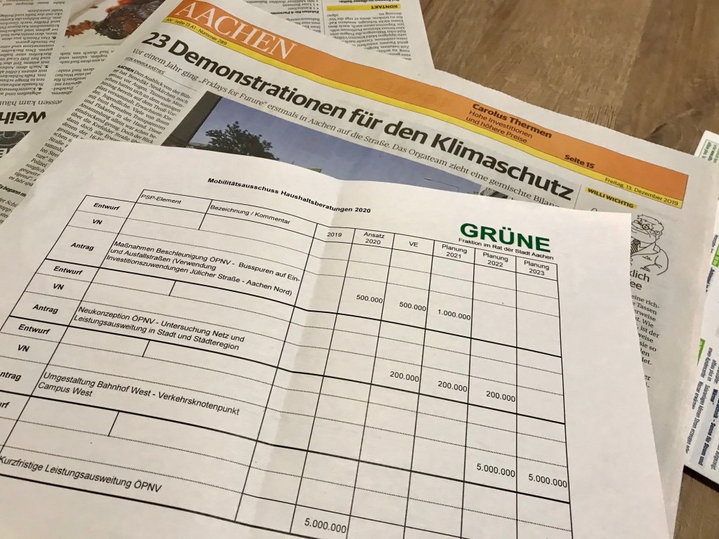 Die Grünen wollten 2020 schon mal 80.000 Euro einsetzen für die Planung einer Fahrradbrücke im Campus West, und 2022 und 2023 jeweils 2 Millionen zum Bau der Brücke. Außerdem sollte (für 80.000 Euro) ein Gutachten das „Parken in Aachen“ dahingehend erforschen, wie man das besser/anders regeln kann, so dass nicht 100.000 Pkw täglich bis mitten in die Innenstadt fahren. Weiter wollten die Grünen 500.000 Euro für Maßnahmen ausgeben, um die Fahrten der ASEAG zu beschleunigen und 2021 noch eine Million für Busspuren, insgesamt auch 200.000 Euro für eine Neukonzeption des ÖPNV usw. usw. usw.
