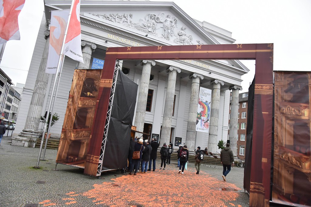 „Das Portal gibt einen ersten Impuls, um schon in der Adventszeit über einen neuen Theaterplatz nachzudenken“, sagte Kulturdezernentin Susanne Schwier. Die Ausmaße des Tores: fünf Meter hoch und neun Meter breit – sind als Hinweis auf die Größe des Projekts gedacht, das dort angegangen wird. Man wolle mit dem Portal, das unter anderem Motive der berühmten Mailänder Scala zeigt, ein erstes Zeichen setzen, ergänzte Generalintendant Michael Schmitz-Aufterbeck.