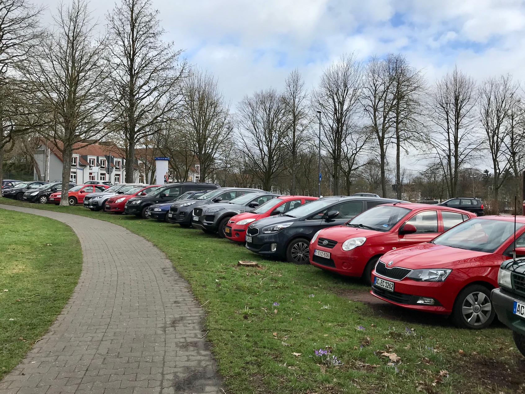 Ob Josef-von-Görres-Straße und Gneisenaustraße oder . . . am Hangeweiher – wie auch sonst im Stadtgebiet, am Rande des Stadtzentrums und in den Stadtteilen: Blechlawinen. Wo man auch hinkommt, parken immer Autos. 90 Prozent aller Aachener Autos parken kostenlos, so schätze ich. Sie benutzen den öffentlichen Raum kostenlos als Abstellplatz für ihre Pkw. Man sollte von jedem 80 Euro im Jahr verlangen. Andere Städte machen das. Aachener und Münchener Allee. Da ich neulich am Hangeweiher zu Besuch war, habe ich nur als ein Beispiel für Aachens Straßen mal schnell einige Fotos gemacht. So sieht es auch z. B. in der Mataréstraße und den umliegenden Straßen aus. Oder anderswo. Dabei sind immer in der Nähe viele freie Parkplätze vorhanden, aber die nutzen die Leute nicht. Sie parken lieber am Straßenrand. Platz satt für die Pkw (ist nahezu leer und bleibt dank Sonderzulassung auch leer). Auch in der Goethestraße ist ein großer Parkplatz, den sah ich noch nie auch nur annähernd voll. Der große Parkplatz an der Goethestraße (mit Schranke gesichert) ist ausschließlich!!! für die Mitarbeiter von Missio und einige wenige andere Privilegierte.Parkhaus am Eisenbahnweg, draußen stehen beidseitig der Straßen die Pkw, das Parkhaus ist immer so gut wie leer. Wie seltsam, gerade wird in unmittelbarer Nachbarschaft noch eine Tiefgarage gebaut (mit Bürogebäude drauf). Nur als Beispiel. Bei Bedarf können wir auf AachenNews noch mehr Fotos liefern. Ja, könnte man doch nur die Bäumchen abholzen, dann wäre noch mehr Platz zum Parken da. Lange müsst ihr nicht mehr warten, liebe AutofahrerInnen. Dann gehen die Bäume von allein ein. Schön, ne?
