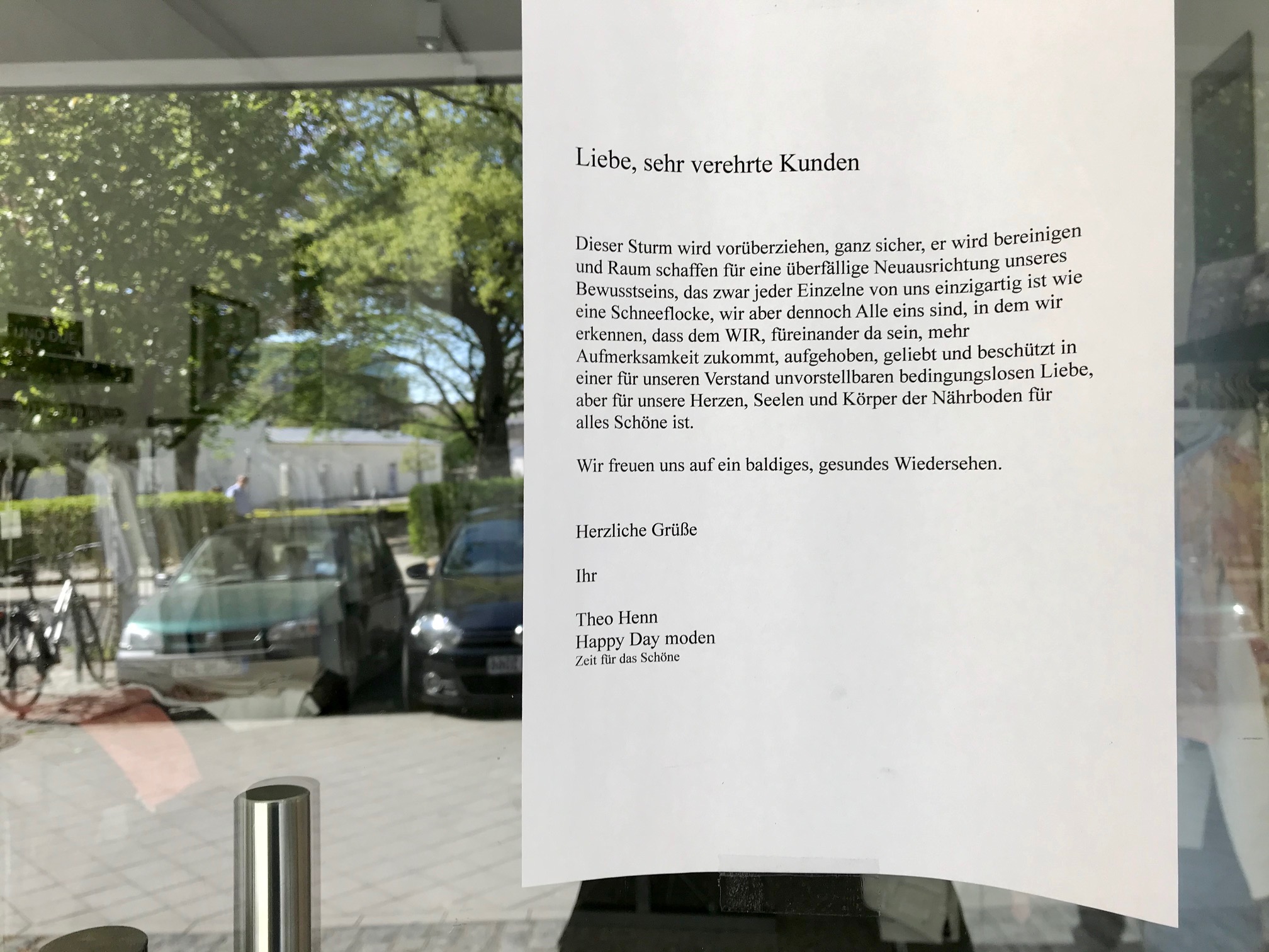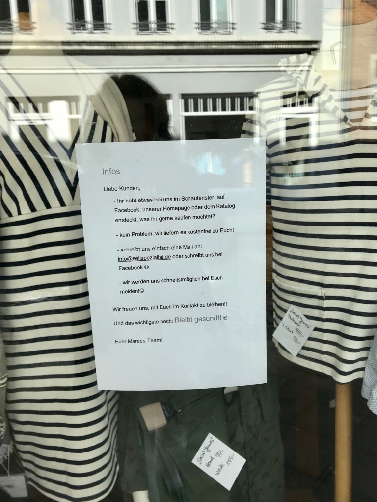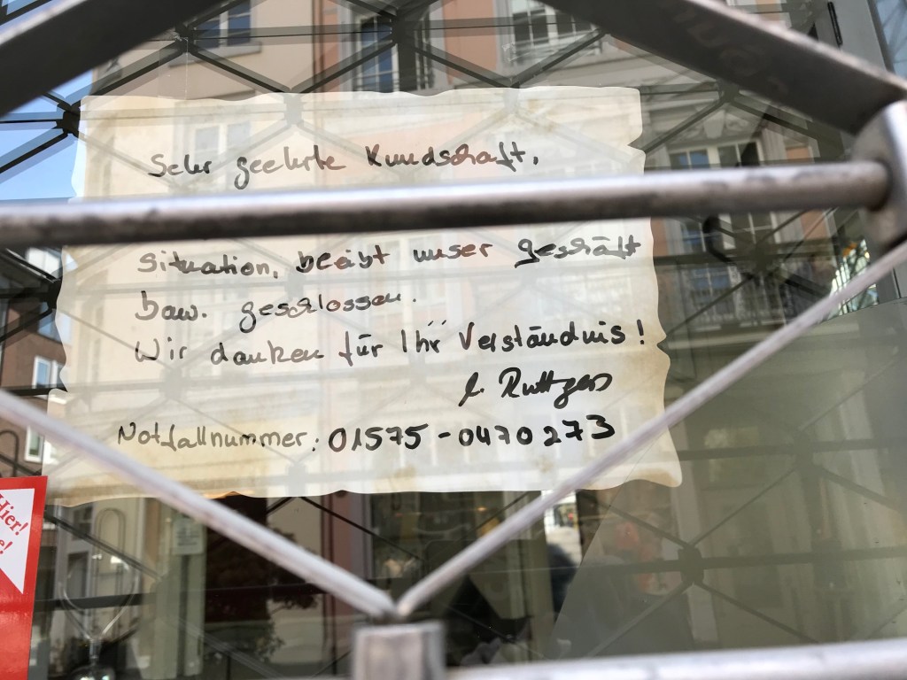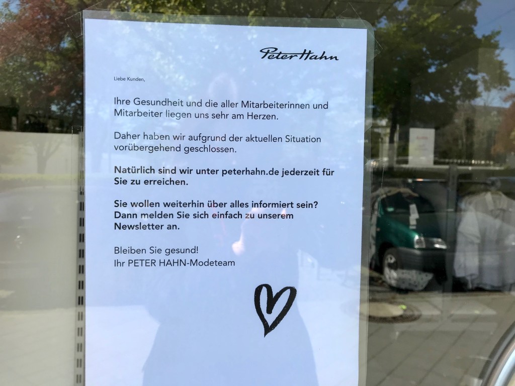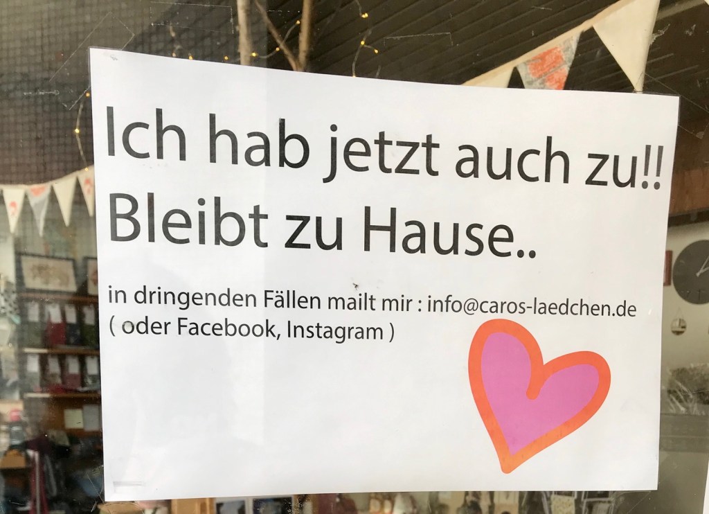 Auf edlem Papier.. . . wir vermissen Sie.Dieser Sturm wird vorüberziehen, ganz sicher, und er wird bereinigen und Raum schaffen für eine überfällige Neuausrichtung unseres Bewusstseins . . . Kurz und knapp.So kennt man Geschäftsleute: Niemals aufgeben!. . . und bleiben Sie wohlauf.50 Gesichtsmasken für 85 Euro.. . . schreibt uns einfach eine Mail.Erst wenn der letzte Laden verschwunden ist . . . . . . derzeit nicht geöffnet.Und immer wieder: Bleiben Sie gesundNatürlich alles nur TOGO. . . gezwungen, unser Geschäft vorerst zu schließen.Alle individuell, und einer sogar mit Herz.Am kommenden Montag geht’s weiter. Bis dahin: siehe unten.