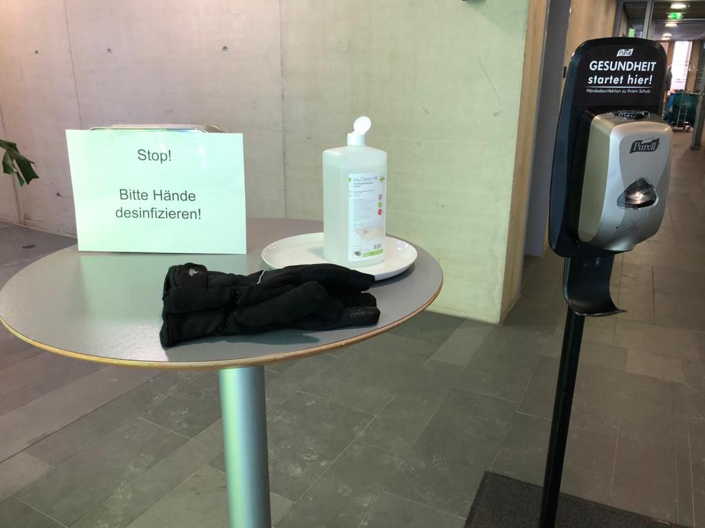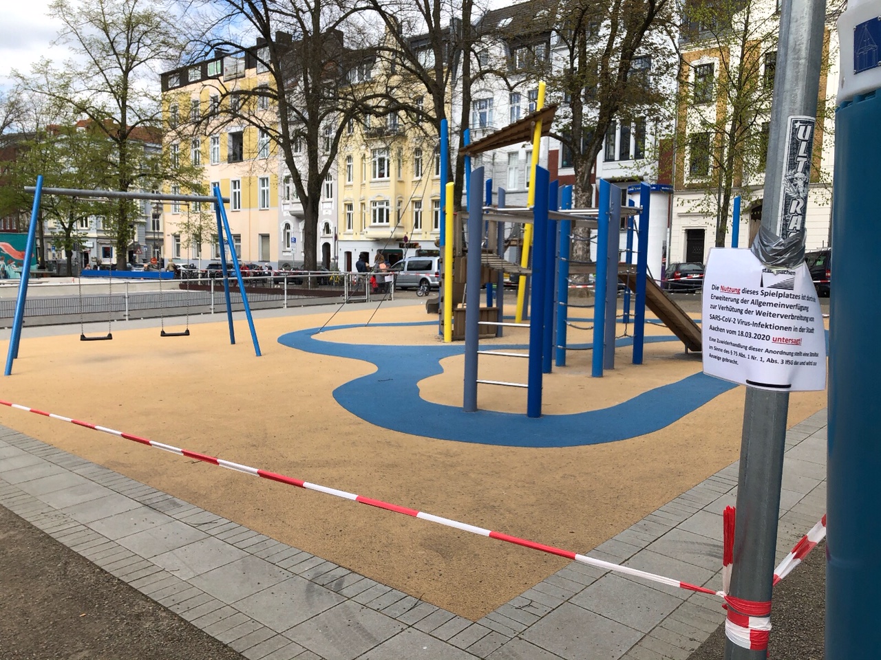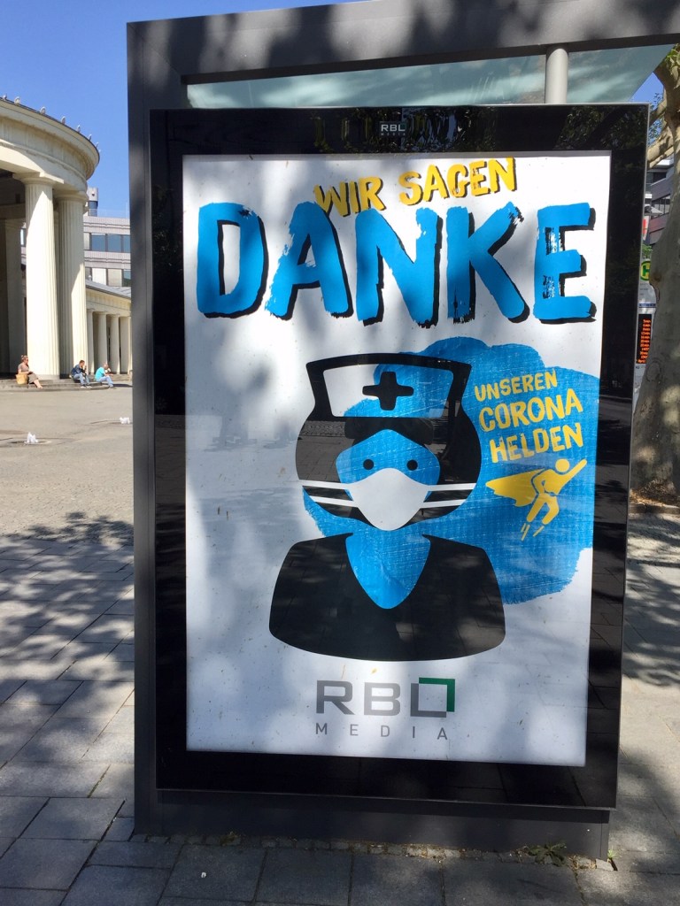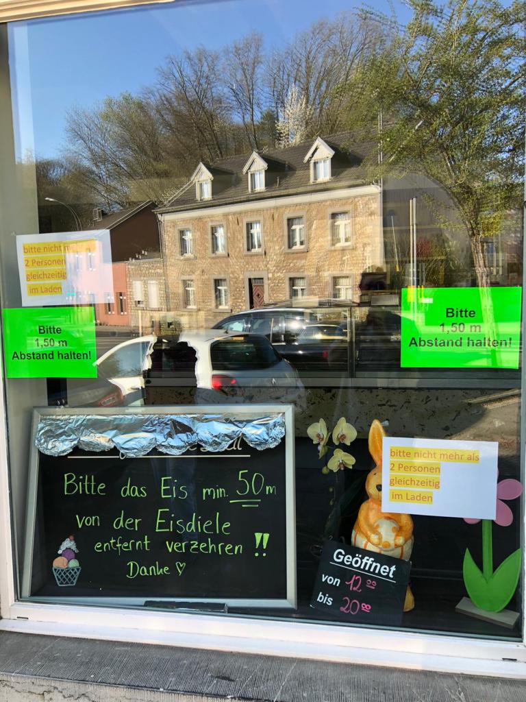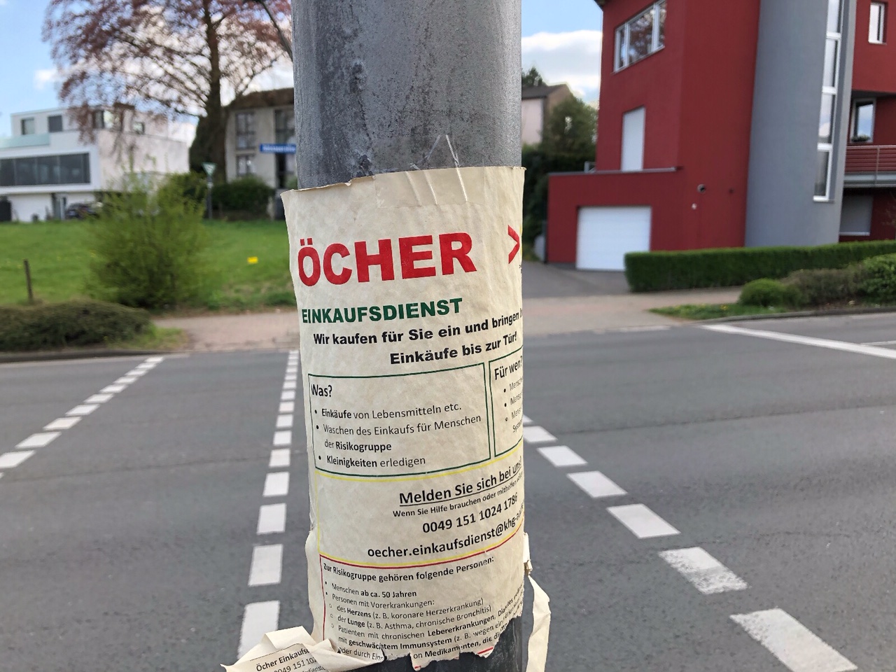 Firmen und Geschäfte fordern im Eingangsbereich ihre Kunden und Mitarbeiter*innen auf, sich die Hände zu desinfizieren. Sie stellen Hygieneartikel zur Verfügung, hier das Softwareunternehmen INFORM (550 Mitarbeiter*innen). Foto: Otto WeberIn Aachen gibt es plötzlich „Einkaufsdienste“. Die Leute fangen an, aufeinander zu achten und sich gegenseitig zu helfen. Foto: Henning BrinkmannMenschen tragen plötzlich Mundschutze, anfangs nur vereinzelt, dann immer mehr. Ab Montag, 27. April, ist es in Aachen Pflicht. Foto: Christine Frels Was man zuvor niemals sah: leere Regale in Aachener Supermärkten (hier: Mittwoch nach Ostern im DM neben Foto Preim). Erst Klopapier, dann Nudeln und Mehl sind ausverkauft. Foto: Henning BrinkmannBesondere Leute bauen besondere Mundschutze. Der Geschäftsführer der Piratenfraktion im Rat der Stadt Aachen rüstet seine Fraktion aus. Foto: Rahu EhanantharajahMund-Nasen-Schutze kann man in Aachen und in ganz Deutschland nicht einfach kaufen. Viele Menschen fangen an zu nähen und tauschen sich darüber aus, wie man richtig näht. Foto: Rahu EhanantharajahKinder dürfen nicht mehr in die Schule, und gleichzeitig sind in ganz Aachen die Spielplätze (hier: Neumarkt, Frankenberger Viertel) gesperrt. Das hätte vor einem Jahr kein Mensch geglaubt, dass einmal kleine Kinder viel mehr strapaziert werden als Erwachsene. Foto: Henning BrinkmannAlle Welt würdigt in der Coronakrise erstmals öffentlich die Arbeit von Krankenschwestern, Erzieherinnen und Frauen an den Supermarkt-Kassen (hier leider in der männlichen Form als „Helden“ bezeichnet). Man möchte sich bedanken und tut es auch. Die schlecht bezahlte Arbeit ist „systemrelevant“, ein Begriff, den man in Bezug auf Banken kennt. Foto: Margret VallotFür religiöse Gruppen ist die Situation ein gefundenes Fressen. Flyer stecken jetzt in allen Briefkästen, es wird behauptet, Menschen hätten sich „mit dem tödlichen Virus der Sünde infiziert“. Von „Mord, Ehebruch, Unzucht, Diebstahl, falschen Zeugnissen, Lästerungen“ und allgemein sehr viel „Verunreinigung“ ist die Rede. Das verstehe wer will . . . Foto: Melissa MarDie Eisdiele der Familie Corona in Walheim, benannt nach der aus Venetien stammenden Familie, erlangt eine gewisse Berühmtheit. Die „Gelateria Corona“ wird vielfach fotografiert und muss mit ungeahnter Popularität umgehen. Foto: Otto WeberDie Kundschaft wird eindringlich aufgefordert, Gyros, Fritten oder eben Eis erst in einem Abstand von 50 Metern von der Verkaufsstelle zu essen. Und mehr als zwei Personen dürfen sich nicht in den Geschäftsräumen aufhalten. Foto: Otto Weber