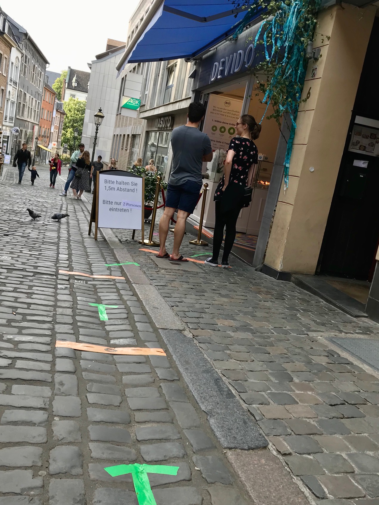 Man konnte sich gestern wieder ein Eis kaufen, aber noch nicht vor den Cafés in der Sonne sitzen. Etliche Geschäftsleute haben für die Wartenden die Straße markiert (s. Foto). Mehr als zwei Personen dürfen in die Geschäftsräume nicht rein, weitere Kunden müssen draußen bleiben und Abstand halten.