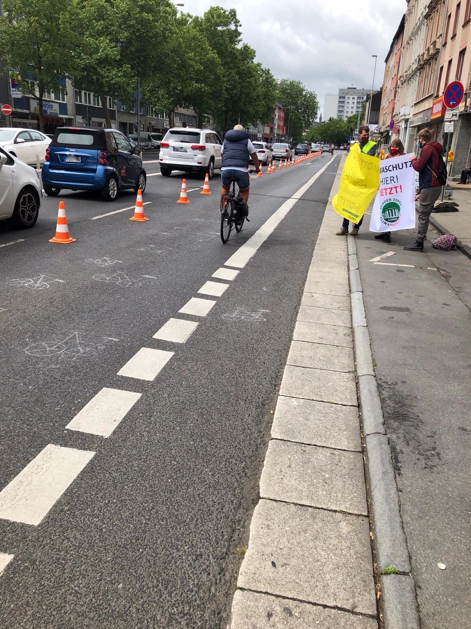 Aktivist*innen haben in Aachen wie in 30 anderen Städten der Bundesrepublik eine Spontan-Radspur gebaut. Heute, Samstag, 23. Mai. Noch bis 13 Uhr könnt ihr die Spur nutzen. Sie befindet sich auf der Jülicher Straße, in der Nähe der Passstraße.