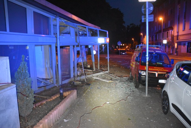Die Polizei teilt mit: „Es sprengten nach Zeugenangaben zwei bislang unbekannte Täter einen Geldautomaten in der Goethestraße. Die Detonation zerstörte den Selbstbedienungsbereich der Bankfiliale. Mehrere parkende Autos in der Nähe und auch Fensterscheiben benachbarter Häuser wurden beschädigt.“