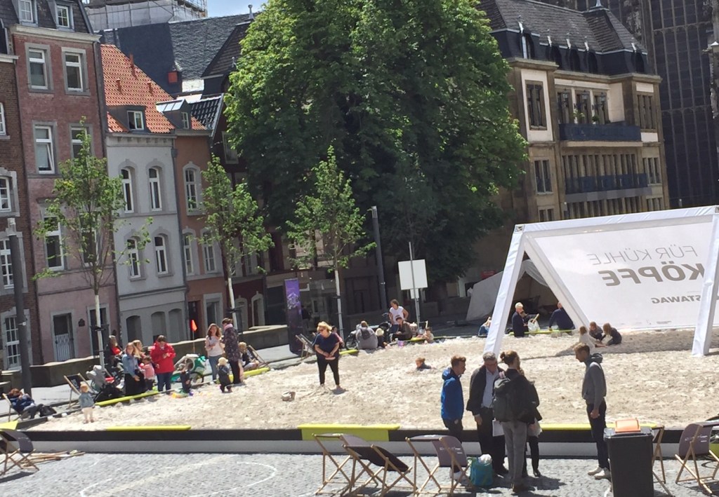 Auf dem Katschhof ist wieder ein Sandkasten aufgebaut, 18 mal 18 Meter groß. 150 Tonnen feinsten Sandes wurden angefahren und ausgeschüttet. Sechs, statt wie früher nur drei Wochen, können Kinder im Sand buddeln. Gestern schon gesehen. Erstaunlich, mit welcher Inbrunst die Kleinen den Sand hin und her bewegen. Rätselhaft, dass ihnen das nach zwei Minuten nicht langweilig wird.