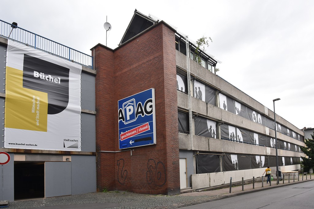 Banner verhüllen jetzt das ehemalige Parkhaus Büchel. Mit dem 30. Juni 2020 endete die jahrzehntelange Nutzung als Pkw-Abstellort endgültig.