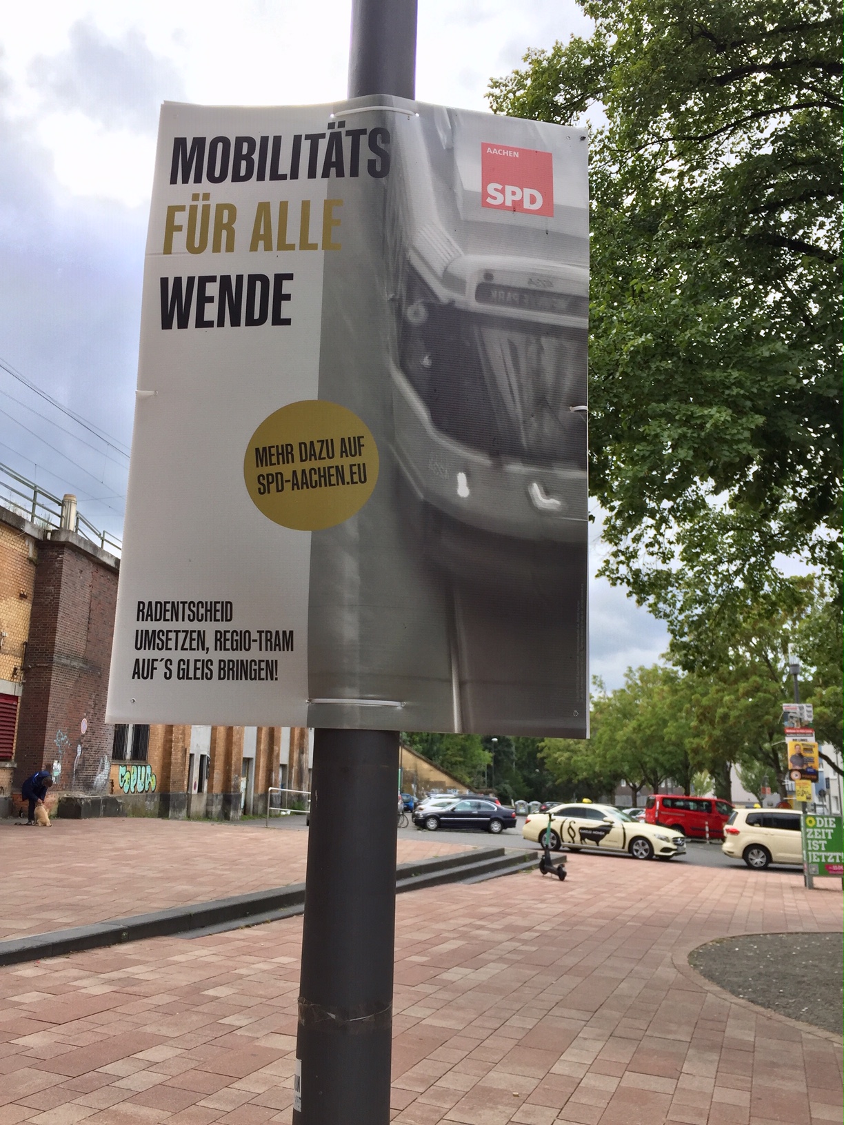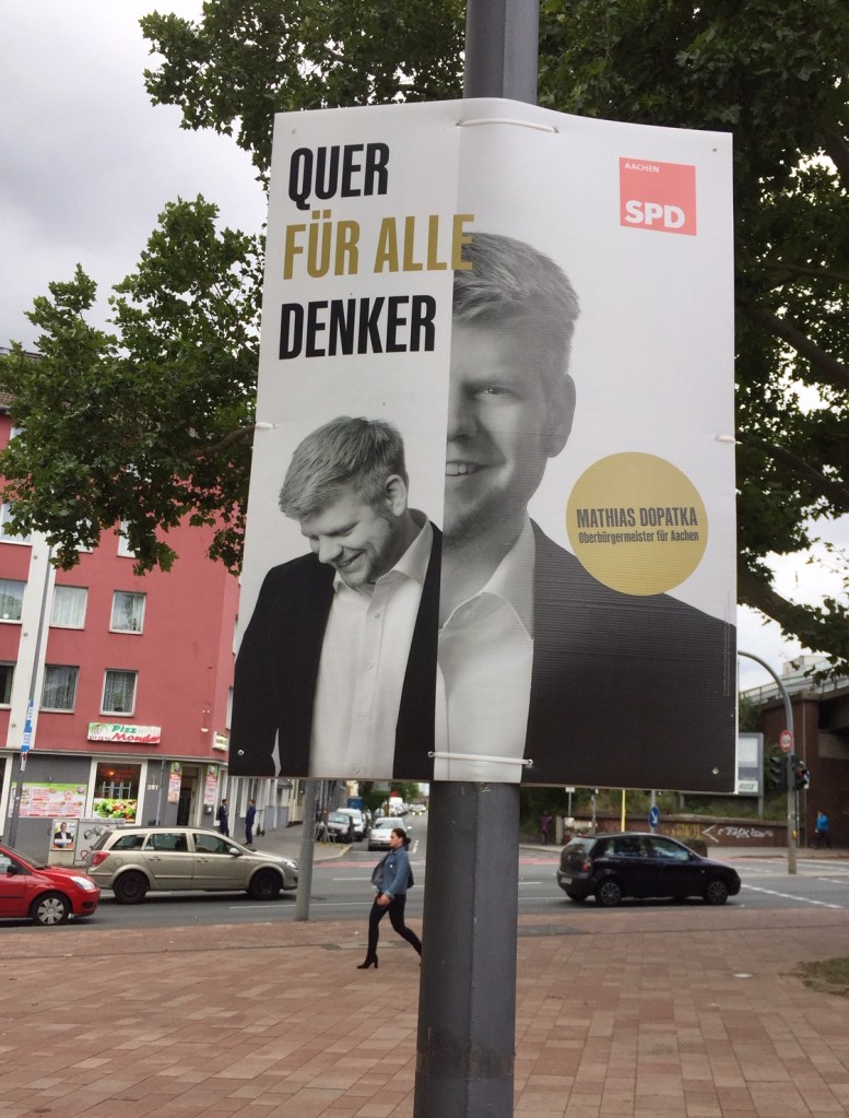 Die Plakate sind schlicht, kaum Farben, mehr schwarz/weiß, ich finde das angenehm. Man hebt sich ab, aufdringlich bunte Plakate gibt es ja im öffentlichen Raum mehr als reichlich. Der Oberbürgermeister-Kandidat komme rüber wie seinerzeit der Spitzenkandidat der FDP (Lindner), wurde den Sozialdemokraten vorgeworfen. Tja, Darstellungsformen ändern sich, wieso sollen Plakate immer so aussehen, als lebten wir noch in den 80er Jahren?