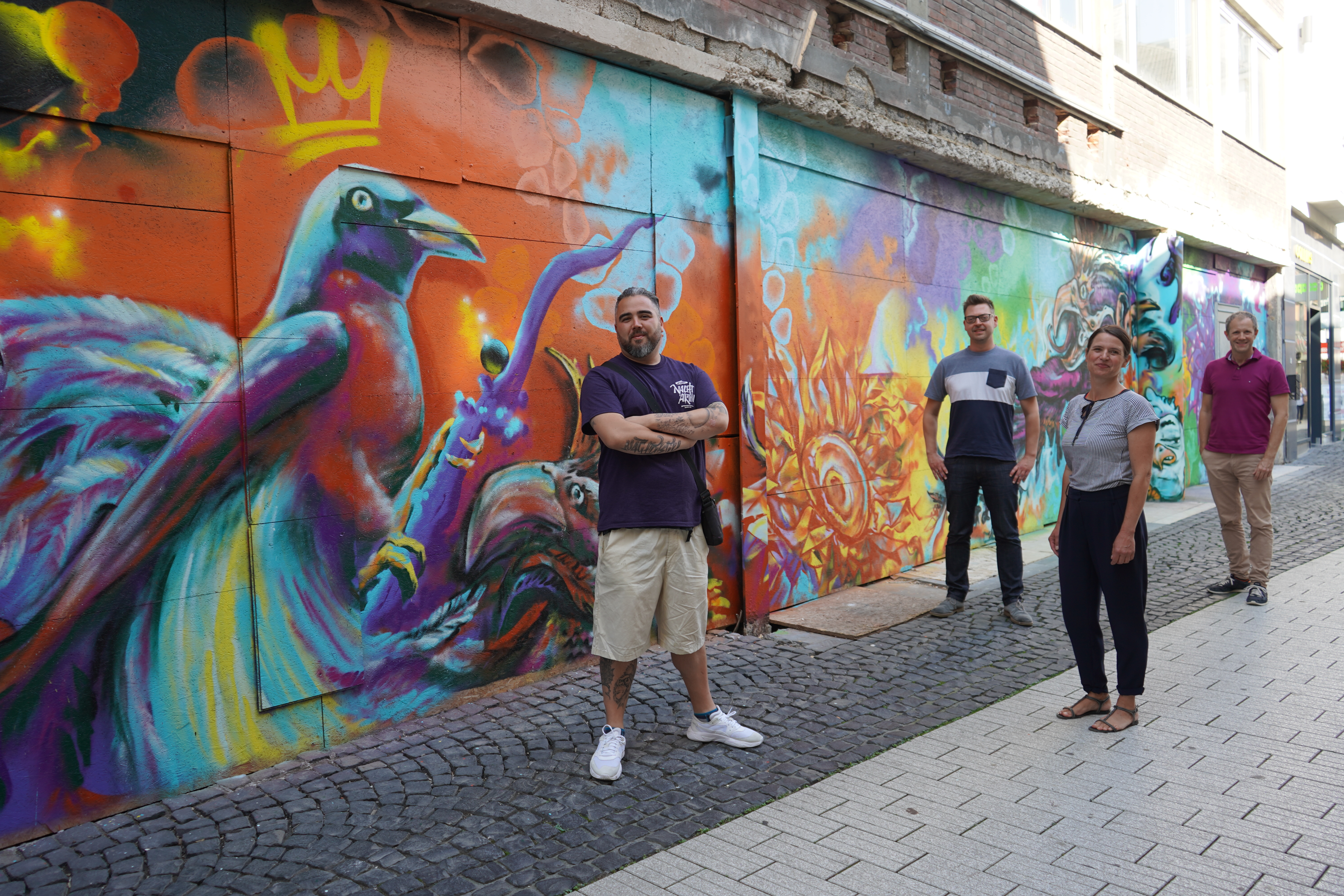 Streetartist Michael Gerst, die Citymanager Dr. Daniela Karow-Kluge und Kai Hennes sowie Kolja Linden, Sprecher der Landmarken AG (v.l.), mit dem Kunstwerk „Phoenix aus der Asche“ am Dahmengraben. Foto: Stadt Aachen/Hedda Faber