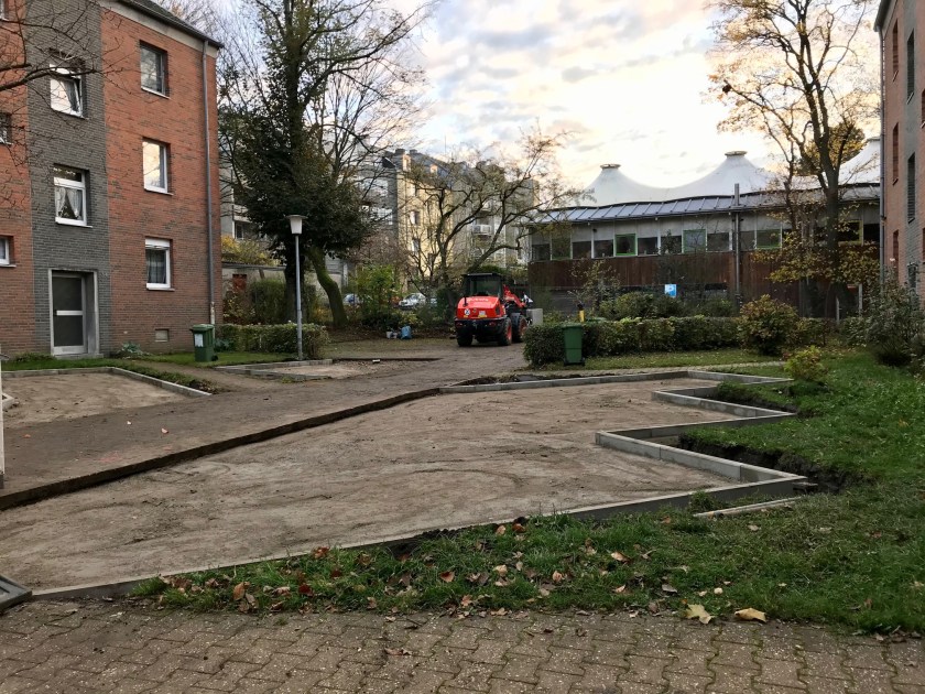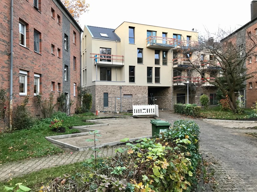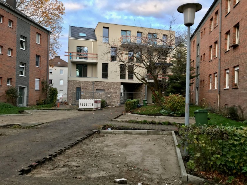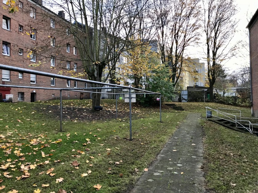 Am Freunder Weg leben ziemlich viele Menschen, die Häuser bilden eine geschlossene Straßenfront. Aber hinter den Häusern, da gibt es kleine Grünflächen, Platz zum Spielen, Sitzen und Wäscheaufhängen. Da kann man natürlich Parkplätze draus machen. Muss man aber nicht.