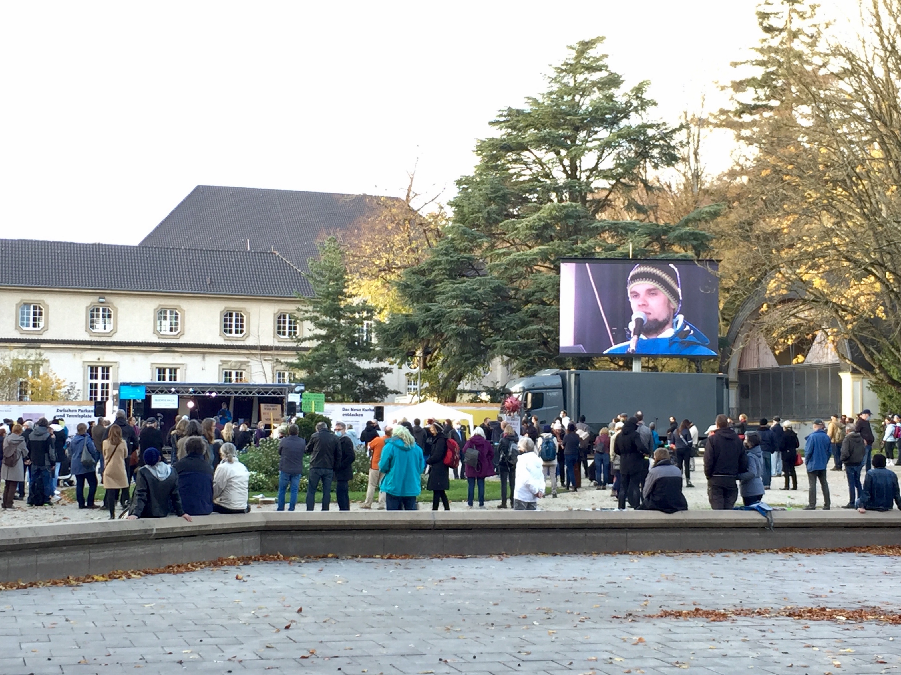 Trafen sich heute im Garten neben dem Neuen Kurhaus und hatten so auch viel Platz, um den nötigen Abstand einzuhalten: die Gruppe „Querdenken241“. Es gab fromme Reden und Gesänge, Musik und immer wieder die Aufforderung, den Abstand einzuhalten und die Masken zu tragen, „weil wir die Veranstaltung durchführen wollen“.
