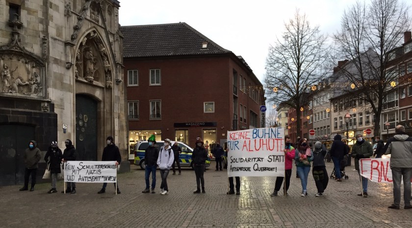 Der Zug ging über die Peterstraße zum Kugelbrunnen und dann hoch zum Markt, wo vor dem Rathaus ein Kranz niedergelegt wurde. Die Polizei hielt sich zurück, begleitete aber die Querdenker, die auf der Peterstraße tüchtig den Betrieb aufhielten. Nur noch eine Demo, bei der behauptet würde, die Erde sei eine Scheibe, könnte uns jetzt mehr perplex machen als das, was wir heute erlebt haben.
