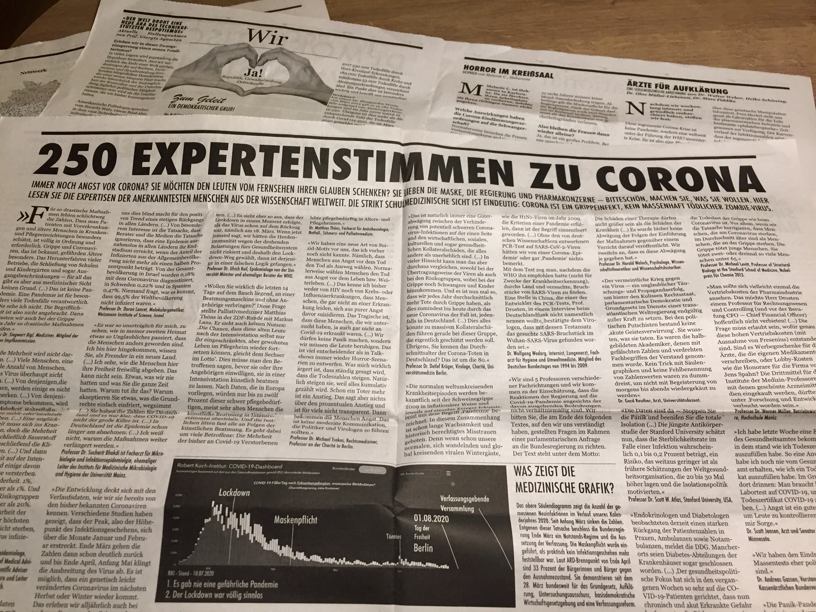 Vor allem anderen schien ihnen die Botschaft wichtig, dass das Corona-Virus angeblich bei weitem nicht so gefährlich ist, wie eine Clique von gemeinen Politikern und der Virologe Christian Drosten, den sie einen Hochstapler nannten, der Welt weißmachen will.