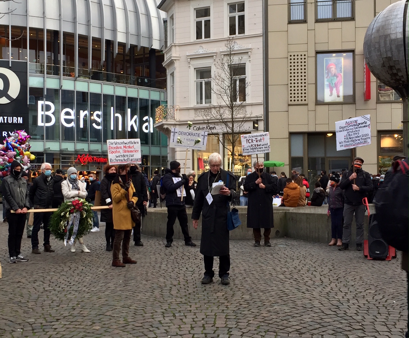 Der Zug ging über die Peterstraße zum Kugelbrunnen und dann hoch zum Markt, wo vor dem Rathaus ein Kranz niedergelegt wurde. Die Polizei hielt sich zurück, begleitete aber die Querdenker, die auf der Peterstraße tüchtig den Betrieb aufhielten. Nur noch eine Demo, bei der behauptet würde, die Erde sei eine Scheibe, könnte uns jetzt mehr perplex machen als das, was wir heute erlebt haben.