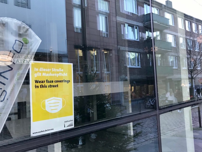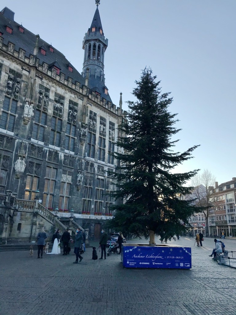 Der traditionelle Aachener Weihnachtsmarkt wurde abgesagt, ein Weihnachtsbaum steht trotzdem auf dem Markt. Vier Weihnachtsmarktbeschicker können ersatzweise ihre Waren in leerstehenden Ladenlokalen um den Aachener Markt anbieten.
