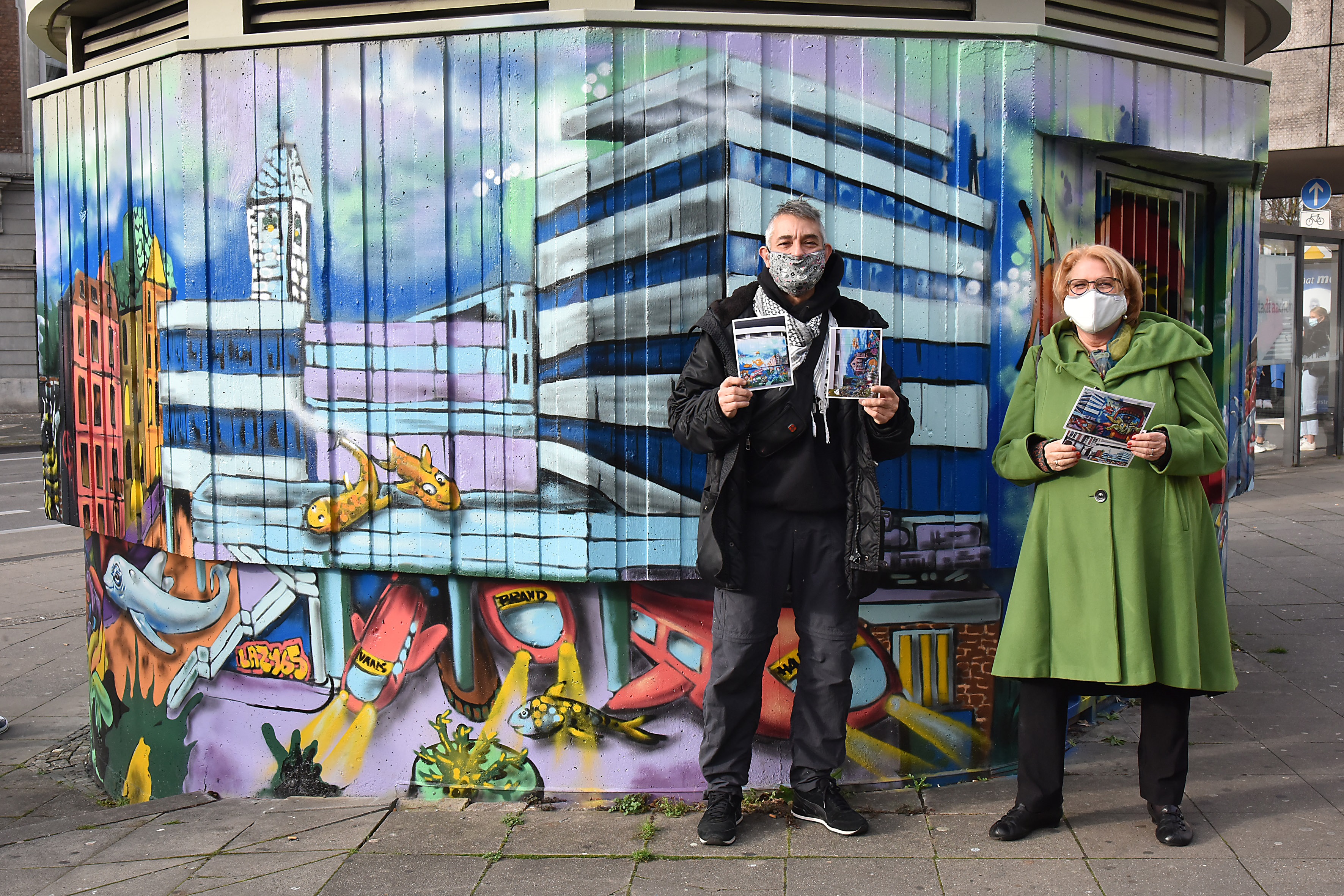 Digital kann man unter dem Link www.aachen.de/streetart einen Blick auf die Postkarten, aber auch die komplette Dokumentation der „StreetArt im Dialog“ am Bushof werfen.