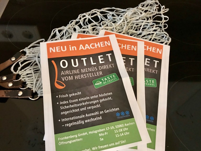 Vor der Frage stand jetzt die Frankenberg GmbH aus Würselen, die gerade in Aachen am Holzgraben 17 – 19 einen Shop eröffnet hat. Dort bieten die einfallsreichen Geschäftsleute und die vielen Köche des Unternehmens eine „internationale Auswahl an leckeren Menüs“ an. Alles, was eigentlich für die Fluggäste von diversen in- und ausländischen Fluglinien bestimmt war, kann mitgenommen werden.