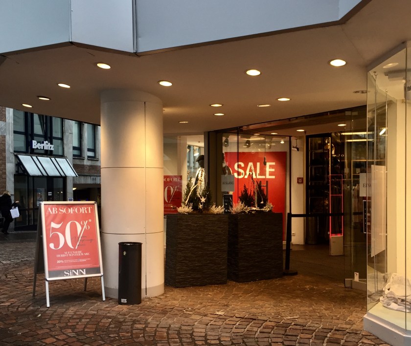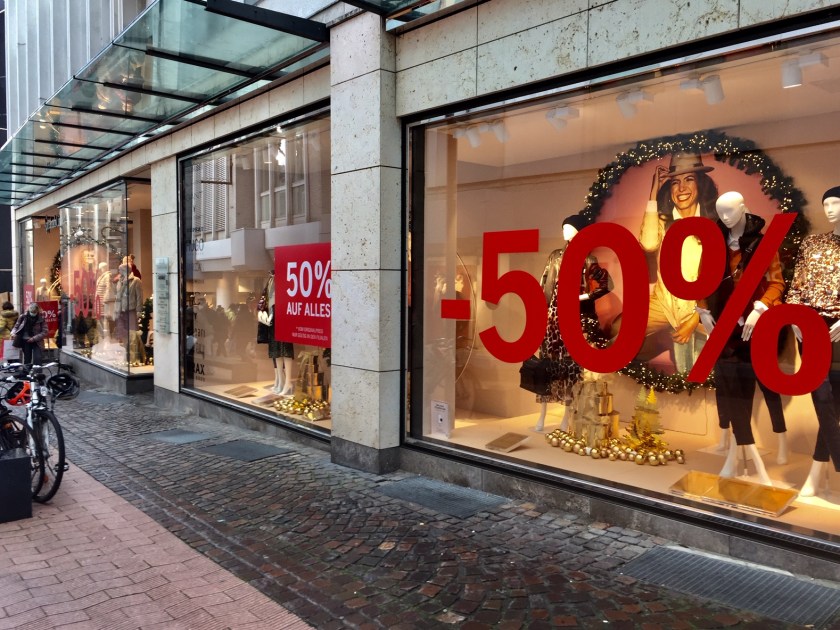 Die Geschäftswelt schließt offenbar eine Verlängerung der Maßnahmen über den 10. Januar hinaus nicht aus und möchte insbesondere nicht auf Bergen von Winterklamotten sitzen bleiben. So kommen jetzt Verbraucherinnen und Verbraucher in den Genuss rasant abgestürzter Preise. Etliche Aachener*innen haben heute schon zugeschlagen, die Straßen in der Innenstadt waren aber viel leerer als sonst.