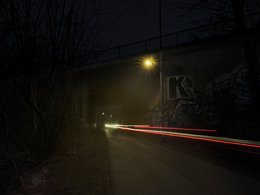 Aus der Stadt kommend steht eine vor der Unterführung, eine direkt dahinter und eine dritte wurde neben einer Sitzbank aufgestellt. Zum Einsatz kommen solarbetriebene Laternen. Zwei davon haben sehr hohe Maste, damit die jeweiligen Solarmodule die Sonne oberhalb vom Madrider Ring einfangen können.