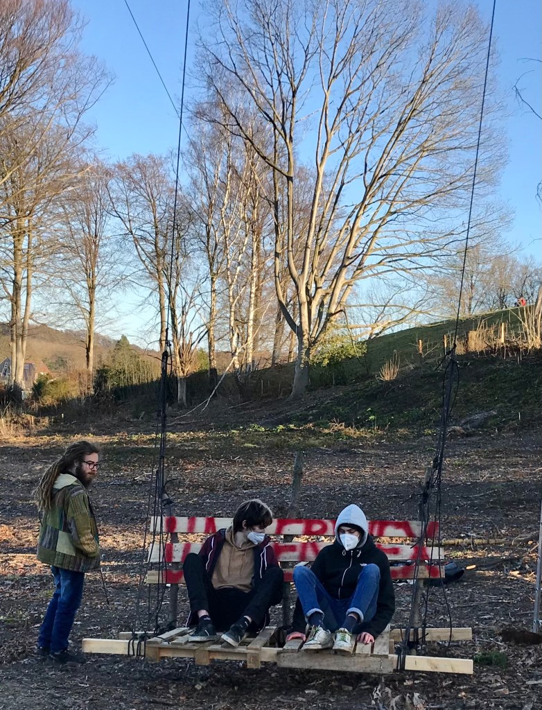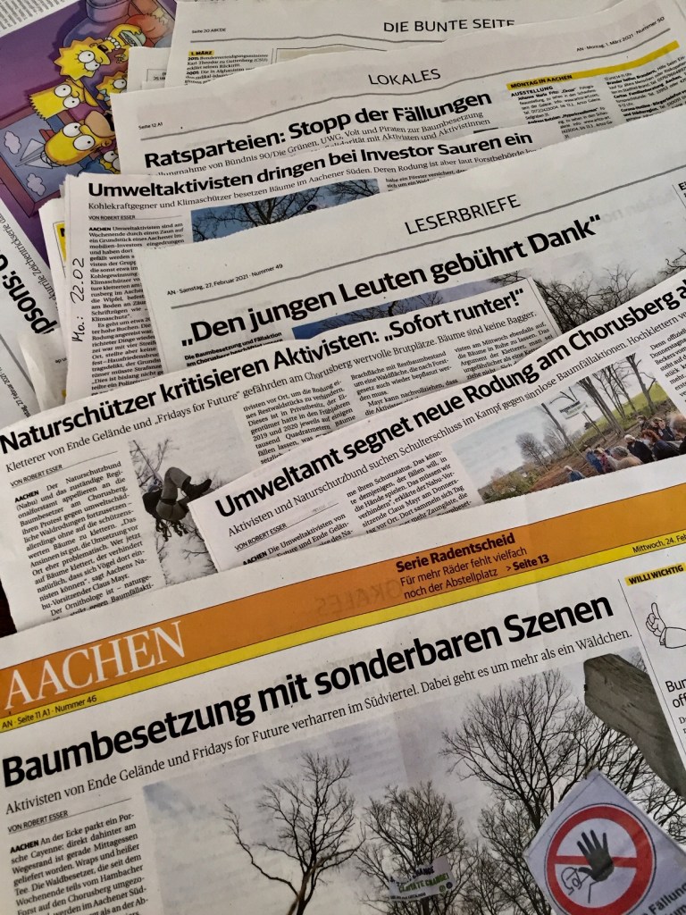 Am Chorusberg in Aachen (wo eher wohlhabende Menschen wohnen), mitten im Landschaftsschutzgebiet, haben seit über einer Woche Aktivisten knapp 20 Bäume besetzt. Sie wollen verhindern, dass Grundstückseigentümer Gerd Sauren dort die letzten verbliebenen Bäume fällen lässt.
