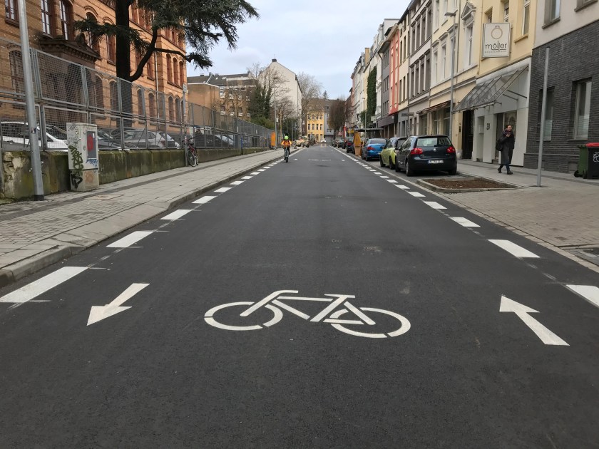 Die rote Farbe ist ein wichtiger Standard für neu angelegte Fahrradstraßen in Aachen, ebenso eine spezielle Markierung auf der Fahrbahn. Die von der Politik verabschiedeten speziellen Standards für Fahrradstraßen können erst jetzt komplett umgesetzt werden. Das hat vor allem damit zu tun, dass das Einfärben und das dauerhafte Markieren nur bei Temperaturen von mindestens vier bis fünf, besser zehn Grad Celsius und komplett trockener Fahrbahnoberfläche möglich sind.