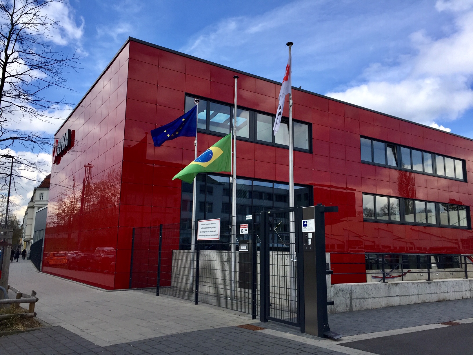 Das fällt auf. Wir sind auf dem Weg zum Stadtarchiv, wo man sich aus alten Zeitungsbänden über Aachens jüngere Geschichte informieren kann. Vor dem roten Gebäude der Rhein Nadel Automation GmbH im Reichsweg weht eine Flagge auf Halbmast – es ist die brasilianische.