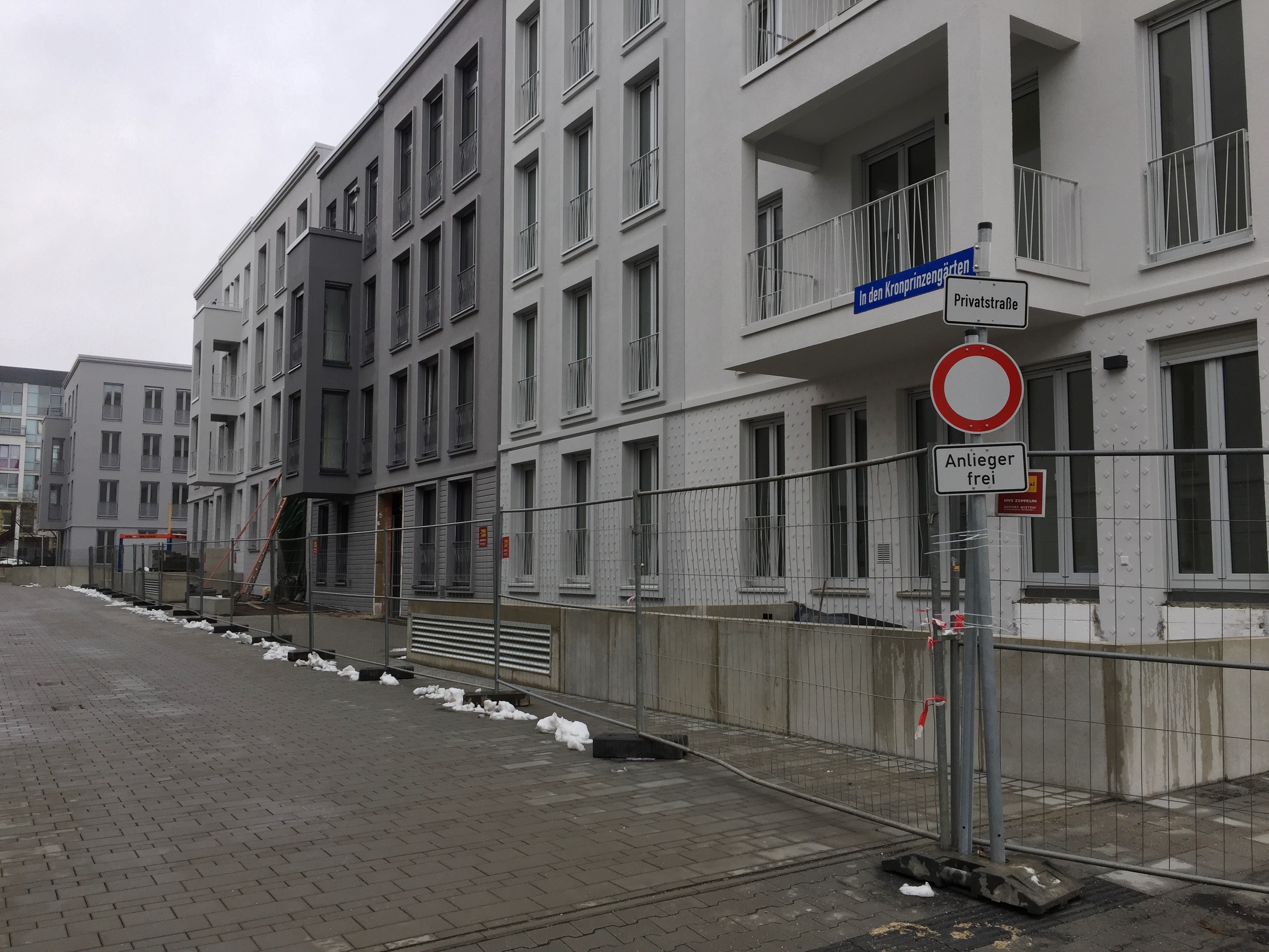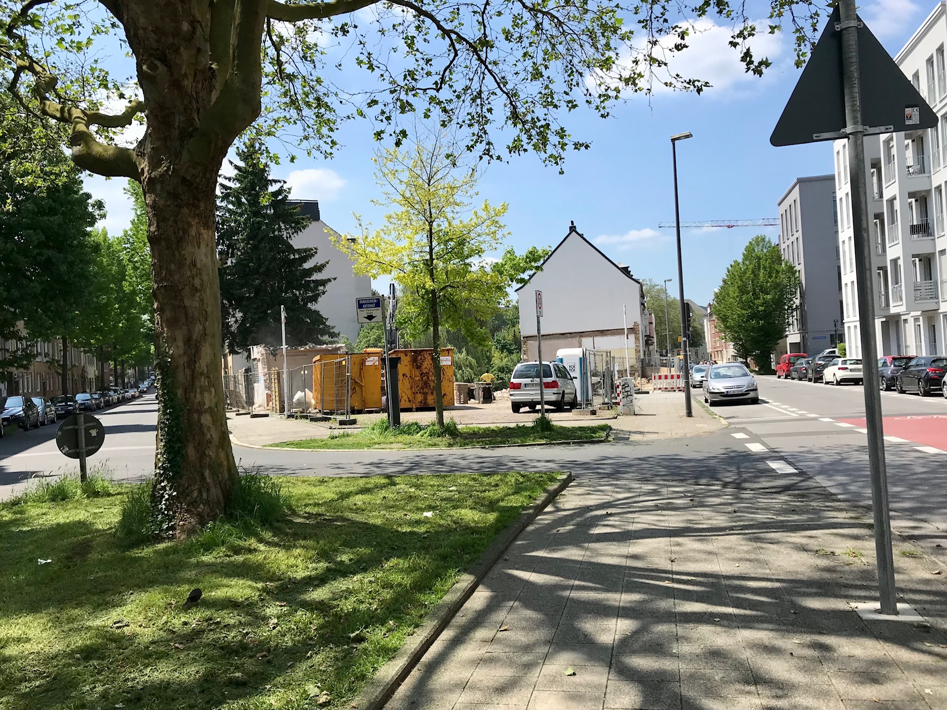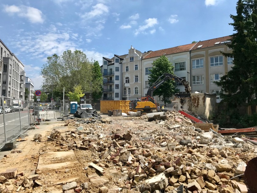 Auf dem Eckgrundstück Beverstraße/Turpinstraße befand sich einmal eine Autowaschanlage. Die ist nur noch ein Haufen Bauschutt, wobei eine ganze Menge Staub hochwirbelte. Direkt gegenüber befindet sich die Wohnanlage Kronprinzenstraße, für die vor einigen Jahren das Finanzamt Aachen-Land abgerissen wurde. Wie das neue Gebäude einmal aussehen wird, ist auf der Seite der Architekten greenarchitecte.eu zu sehen. Unten auf den Link klicken. Das neue Gebäude passt sich farblich seinem Gegenüber an: Es wird grau. Keine Ahnung, was Architekten und Bauherren und -damen an der Farbe Grau so toll finden.