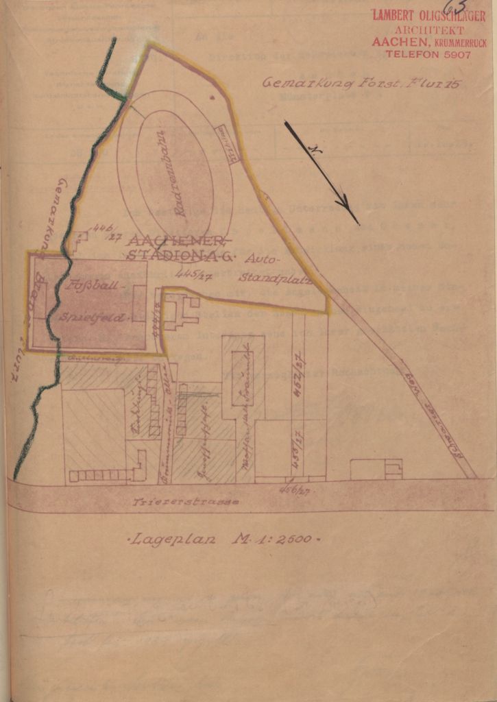 Im Vordergrund des Plans ist die Trierer Straße mit der damaligen Bebauung zu sehen. Von hier führt die damalige Krummerück-Allee zum gelb umrandeten Sportgelände.