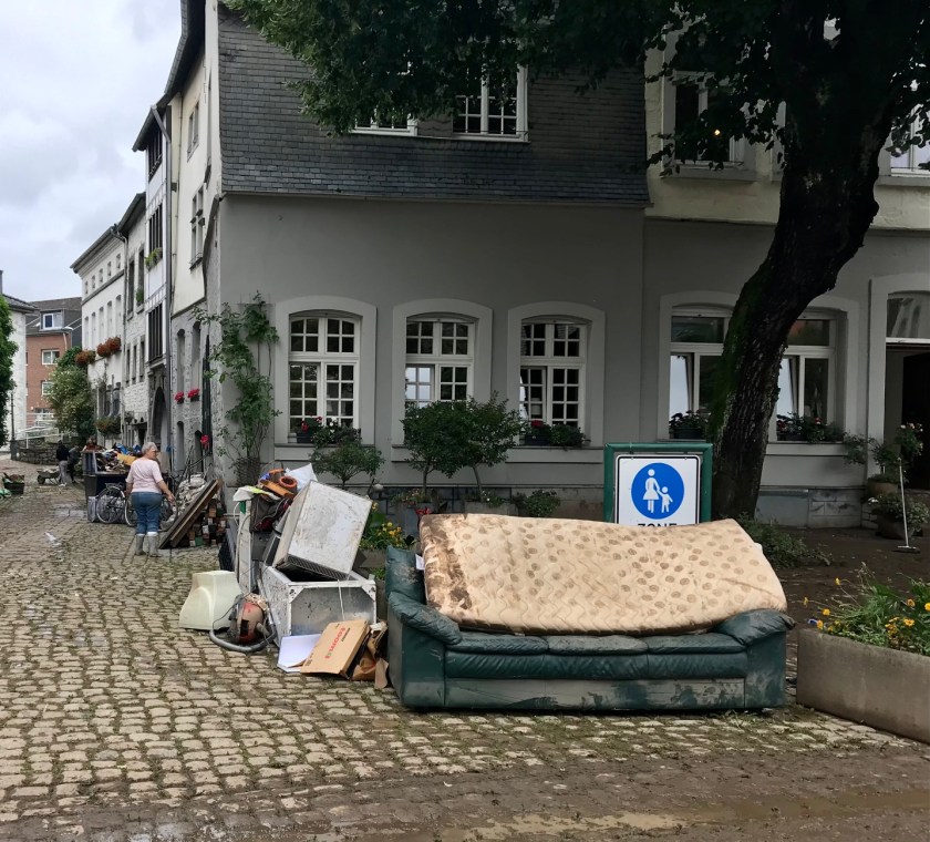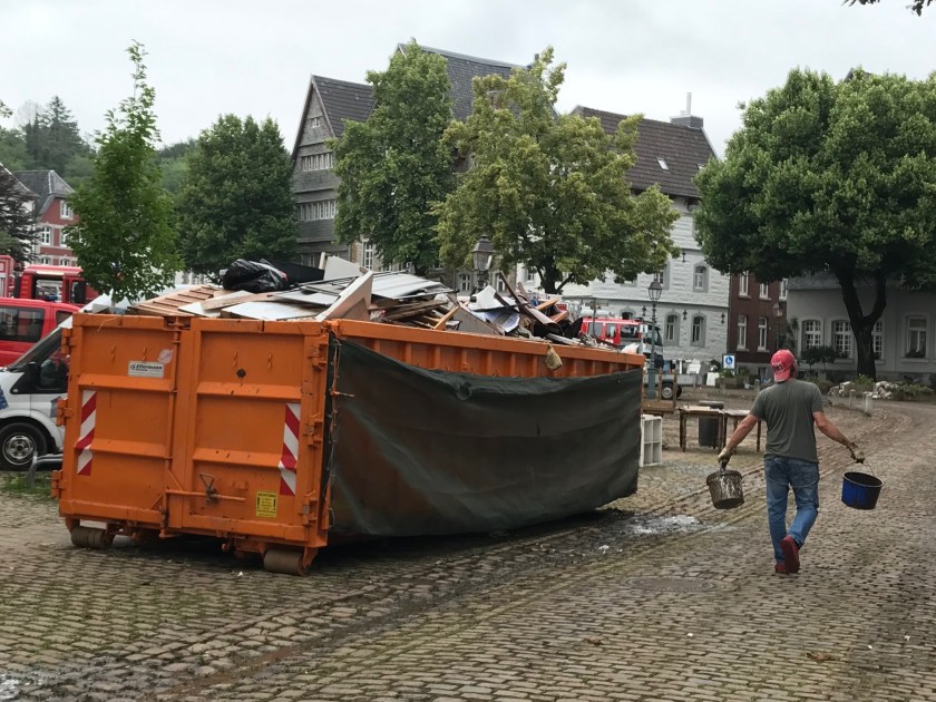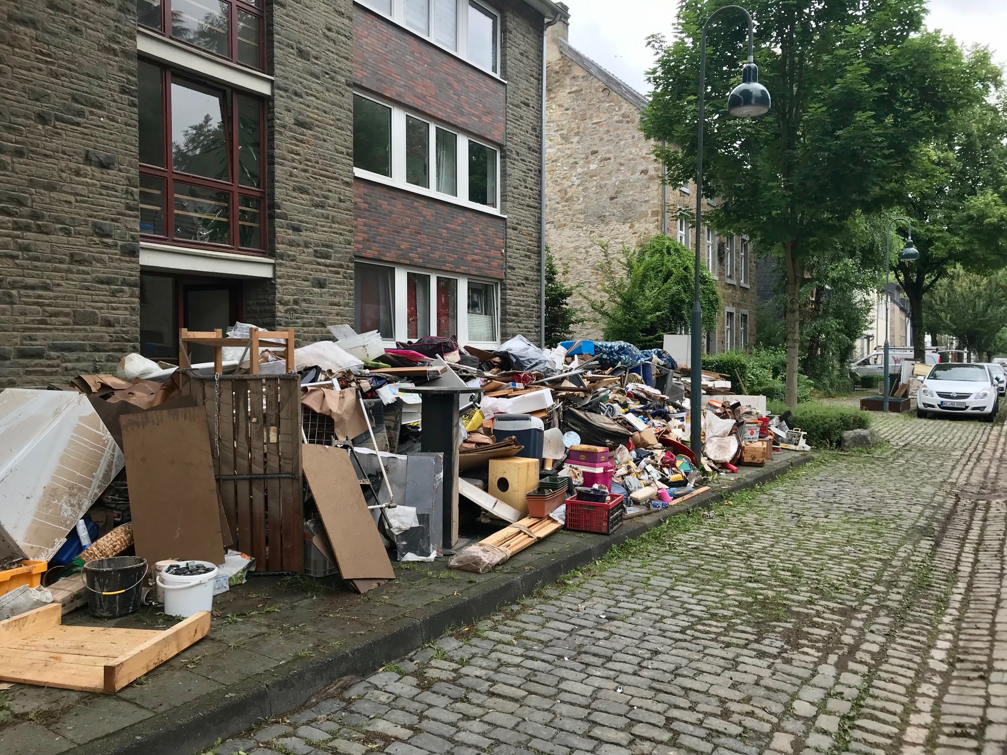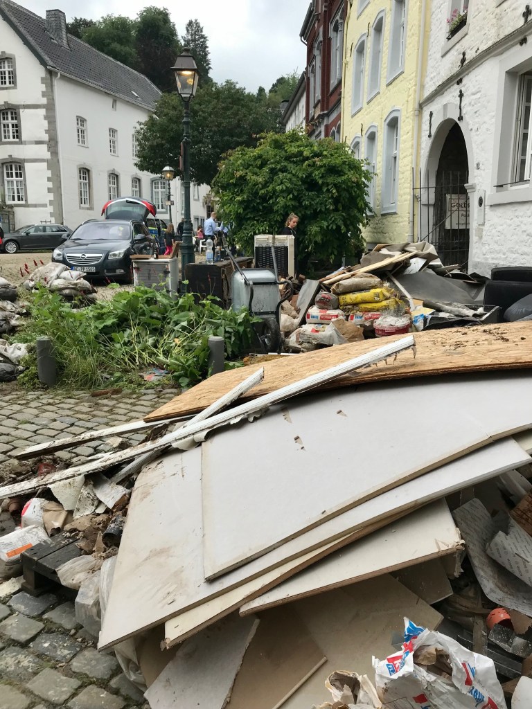 Das Wasser ist weg, das Ausmaß der Zerstörung ist gigantisch – in Aachen betrifft es vor allem den tief gelegenen Ortskern von Kornelimünster. Dort haben die Anwohner*innen und Geschäftsleute ihr komplettes Mobiliar und alle Küchengeräte verloren, ganze Ladeneinrichtungen und Restaurant-Einrichtungen sind nur noch Schrott. Und: innen ist alles voll Schlamm, Erdgeschosse sind vorerst unbewohnbar. Fürch-ter-lich.