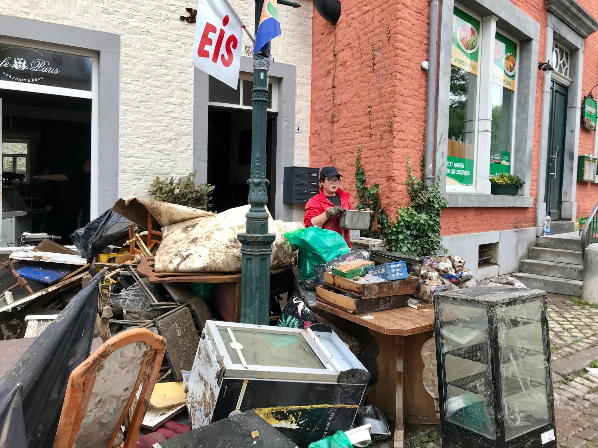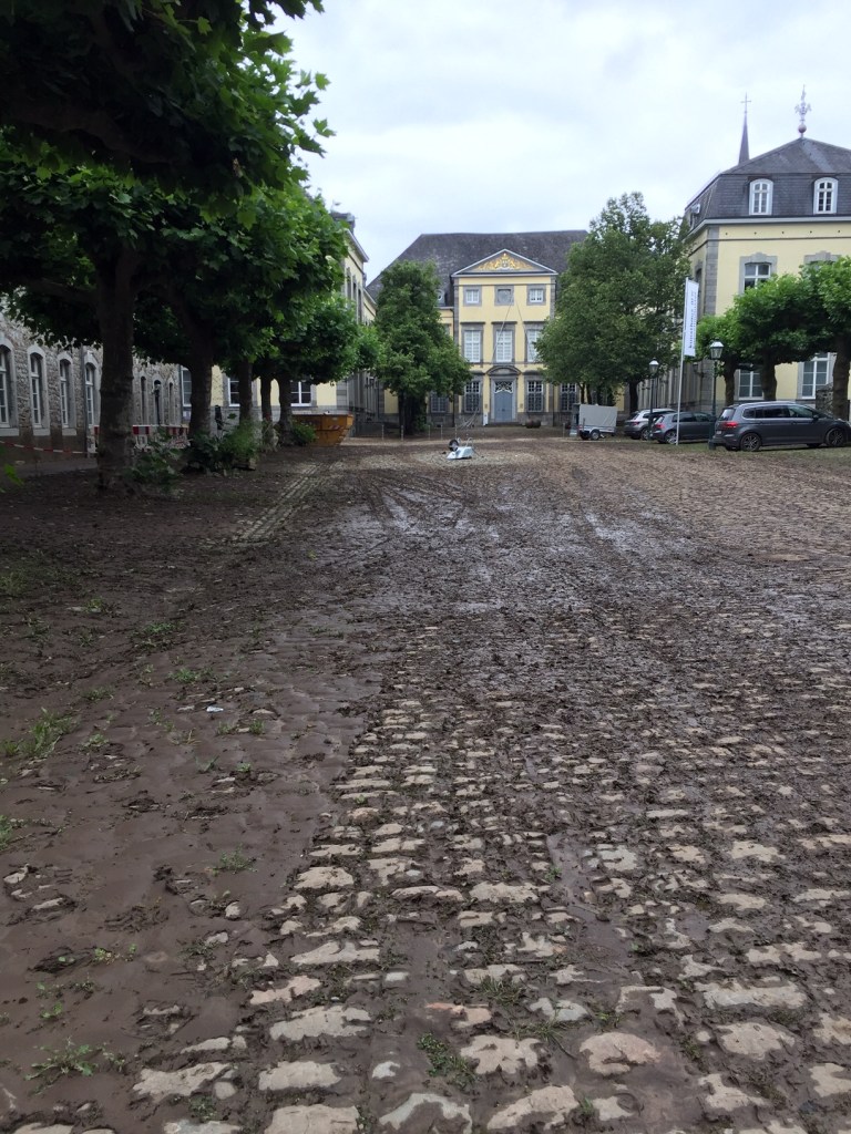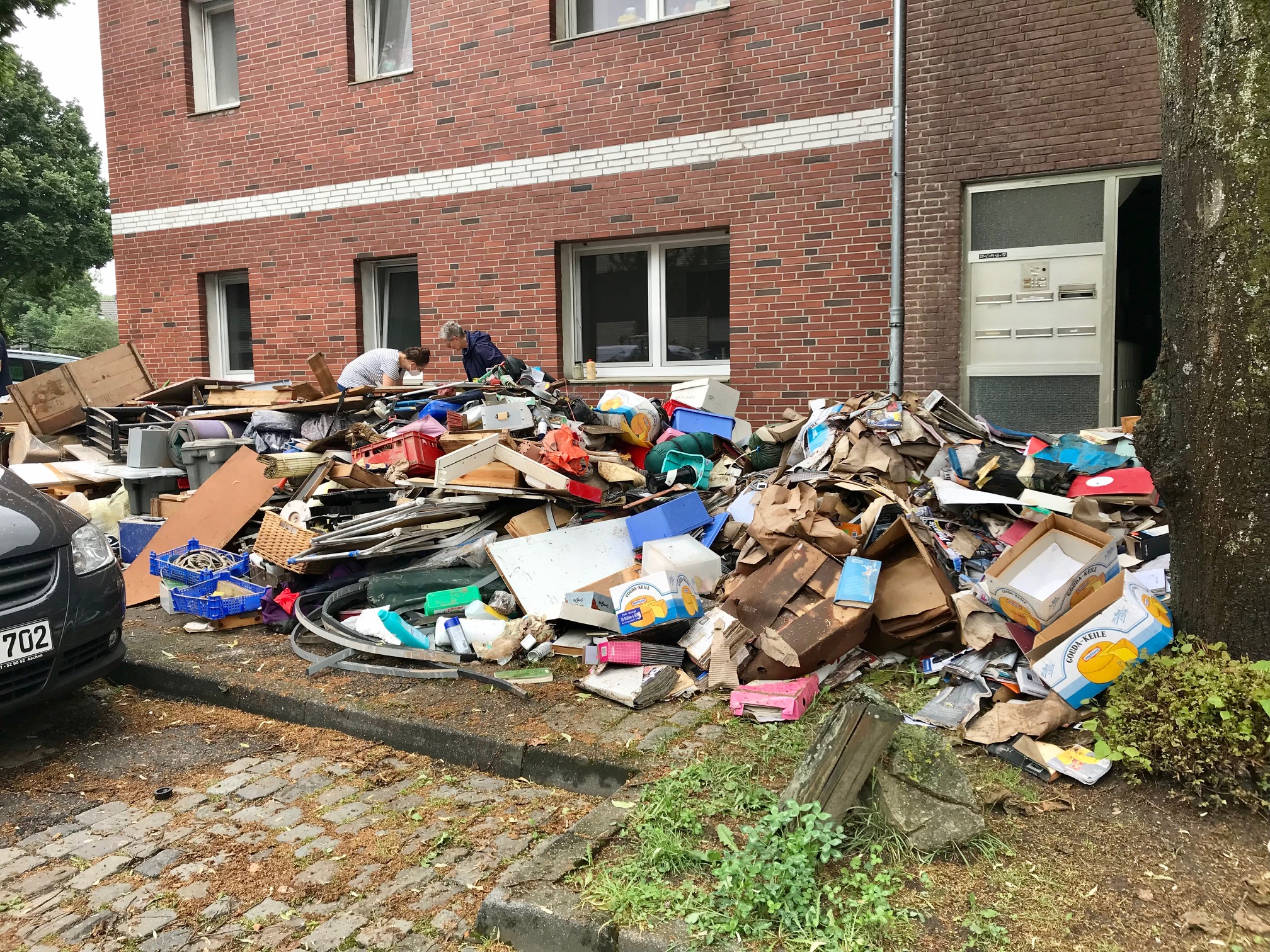Das Wasser ist weg, das Ausmaß der Zerstörung ist gigantisch – in Aachen betrifft es vor allem den tief gelegenen Ortskern von Kornelimünster. Dort haben die Anwohner*innen und Geschäftsleute ihr komplettes Mobiliar und alle Küchengeräte verloren, ganze Ladeneinrichtungen und Restaurant-Einrichtungen sind nur noch Schrott. Und: innen ist alles voll Schlamm, Erdgeschosse sind vorerst unbewohnbar. Fürch-ter-lich.