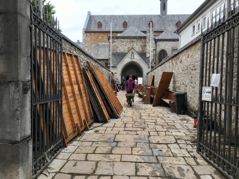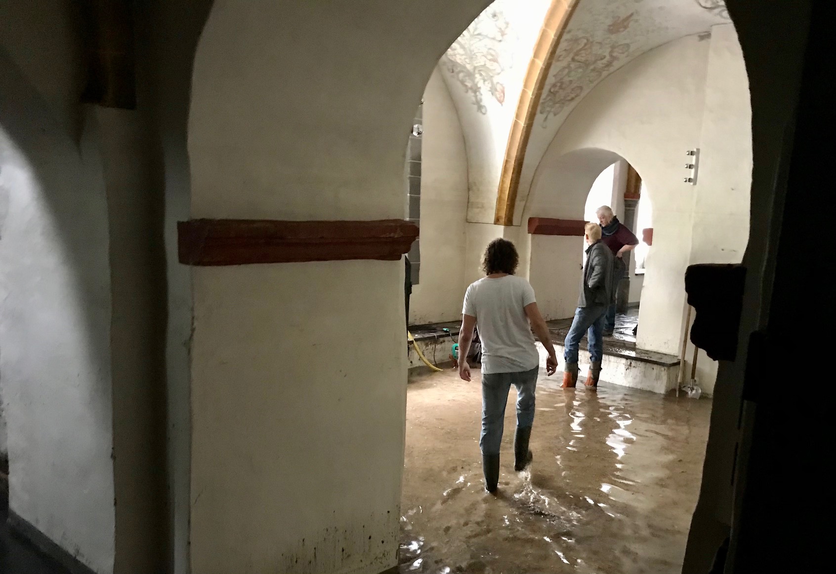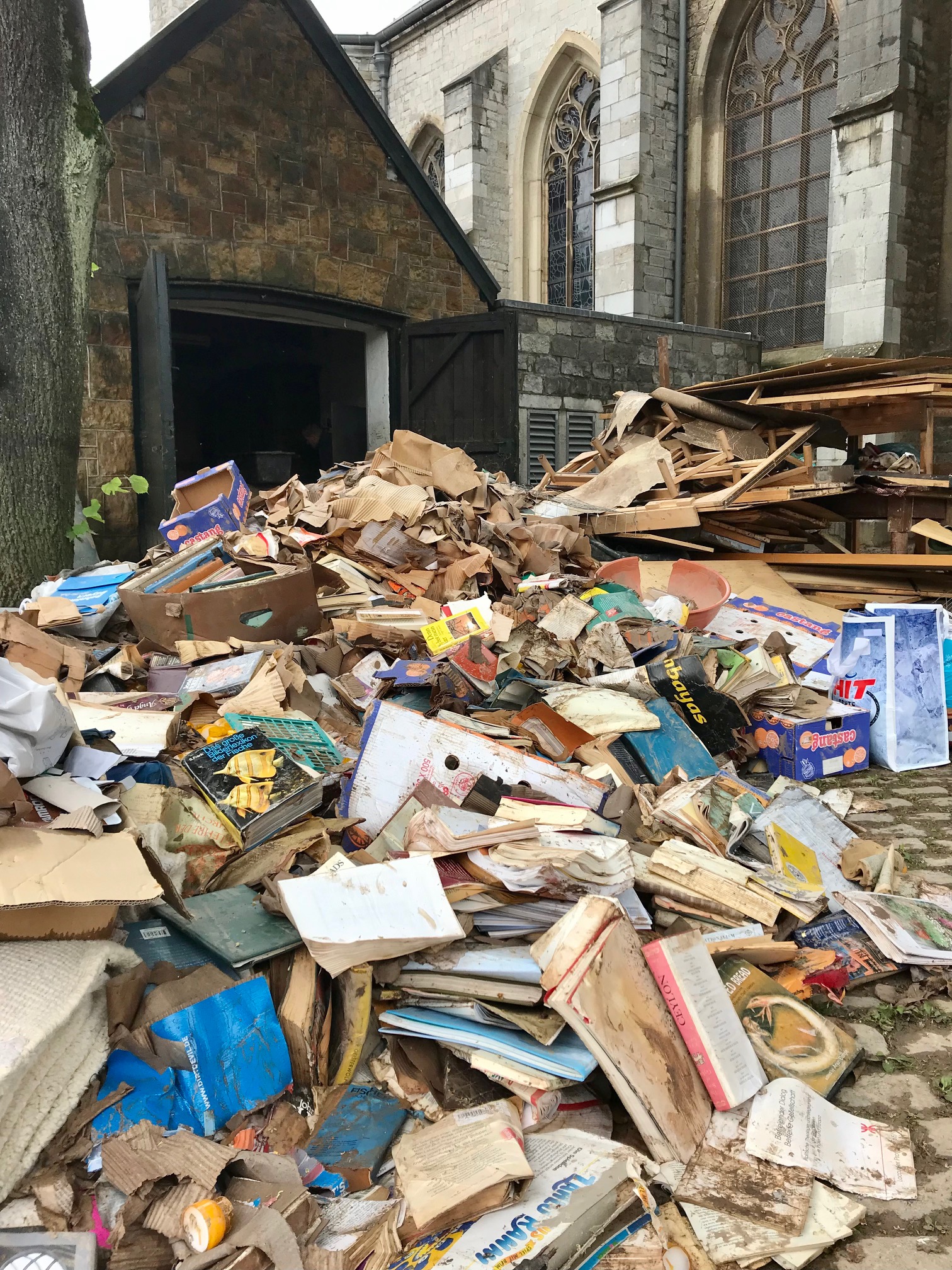 Alles, was den Menschen einmal lieb und teuer war, landet jetzt in Müll-Containern. Auch in die Abteikirche St. Kornelius hatte sich das dreckige Wasser der Inde ergossen. Der Boden der Kirche war noch gestern mit Schlamm bedeckt. Wasser stand in Nebenräumen.