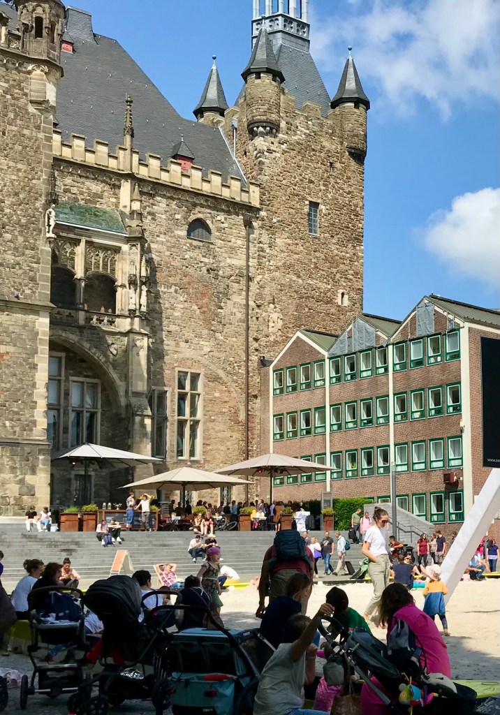 - Gute Idee: Zwischen den Dom (Weltkulturerbe) und das Rathaus hat der Aachener Stadtbetrieb 150 Tonnen Sand gekippt.