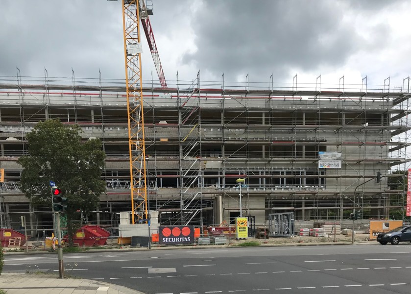 Nach dem BlueGate am Bahnhof und den Neubauten am Freunder Weg sind beim Radeln durch Aachen zwei weitere, relativ große Bauprojekte aufgefallen. An der Dresdener Straße zieht der Bauherr, die Aachener Verlagsgesellschaft, ein neues Bürogebäude hoch. Jüngst wurde schon Richtfest gefeiert, wie man der Homepage (mit interessantem Blick von oben) entnehmen kann.