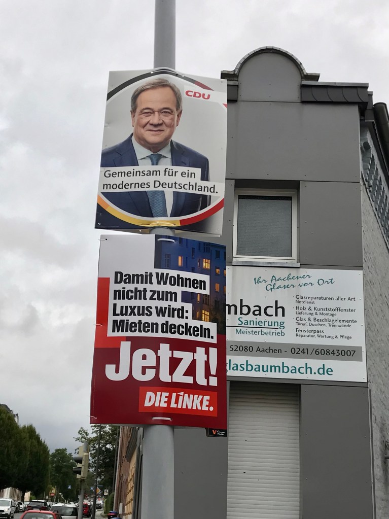 Ebenfalls ungewöhnlich ist, wie sehr das politische Feld sich unterscheidet. Man hat tatsächlich die Wahl zwischen ganz verschiedenen Angeboten. Hier der freundliche Onkel aus Aachen, der ein bisschen Bonner Republik aufscheinen lässt. Dort die rote Truppe der Sozialdemokraten, die mit konkreten Vorhaben und Plänen um die Ecke geprescht kommt (davon in einer späteren Folge mehr).