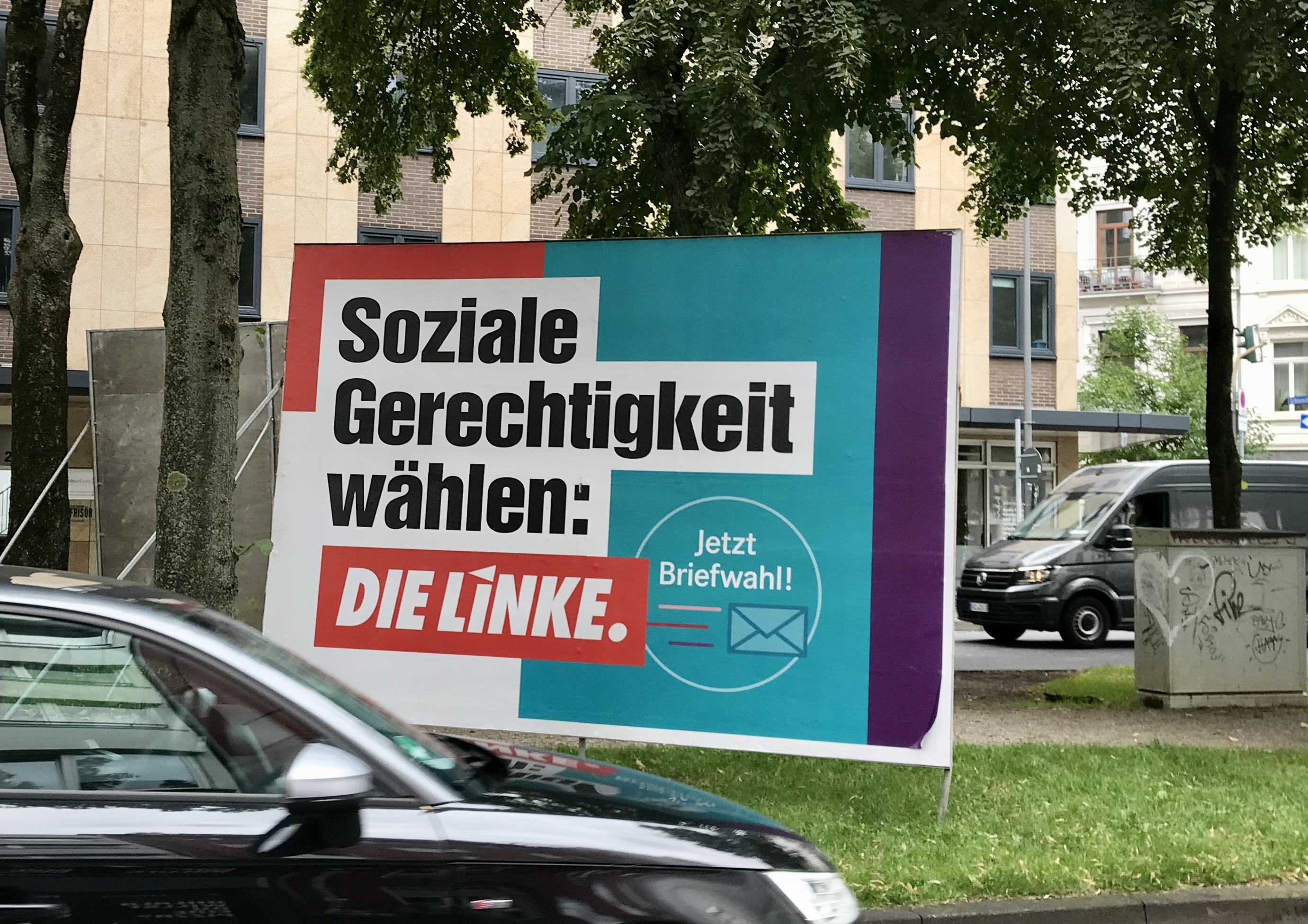 Diesmal kann wirklich niemand sagen: „CDU und SPD – das ist doch alles dasselbe.“ Wie diffus die CDU bleibt, und wie konkret andere werden, lässt sich zeigen an zwei Plakaten, die in Haaren zufällig übereinander hängen. Ein Unterschied wie Tag und Nacht!