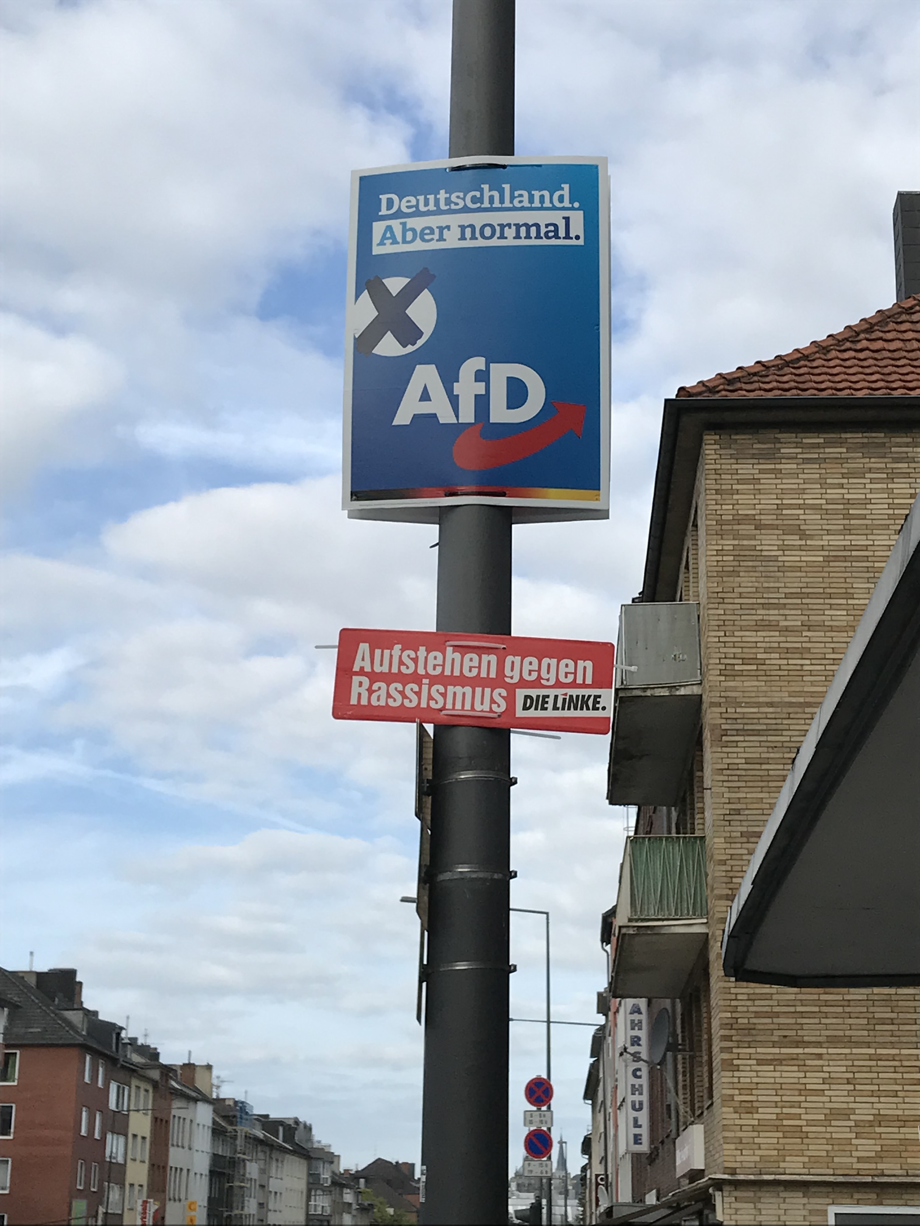 Erst an diesem Wochenende sind in Aachen – soweit ersichtlich – Wahlkampfplakate der AfD im Straßenraum aufgetaucht. Sie sollen hier, wie die Plakate der anderen Parteien, eine kurze Betrachtung erfahren. Der Slogan der AfD lautet „Deutschland. Aber normal.“