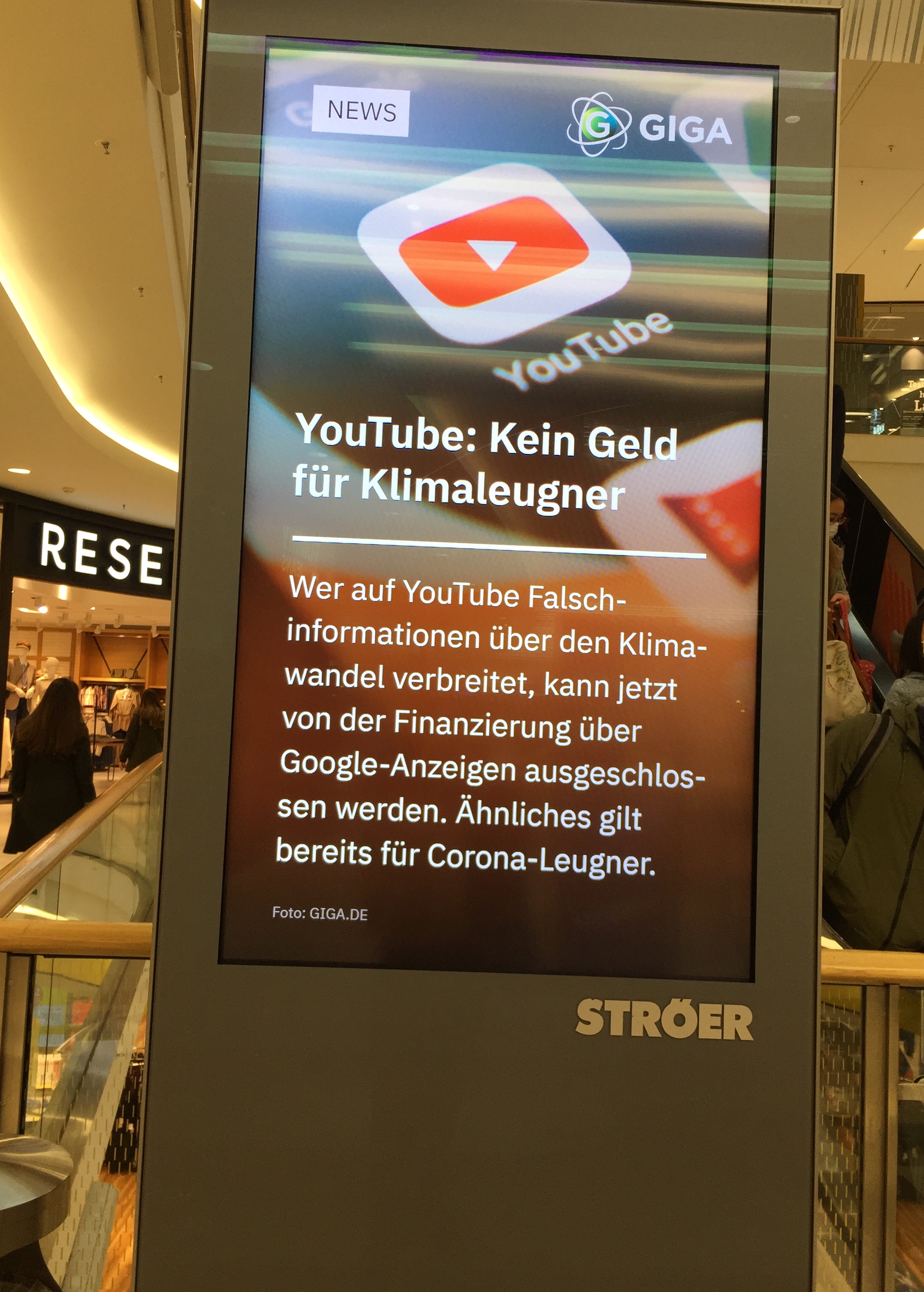 Leugnen lohnt sich nicht. Das konnte man heute im Aquis Plaza auf einer dieser beleuchteten Werbetafeln lesen. Google dreht Klima-Leugner*innen den Geldhahn zu.