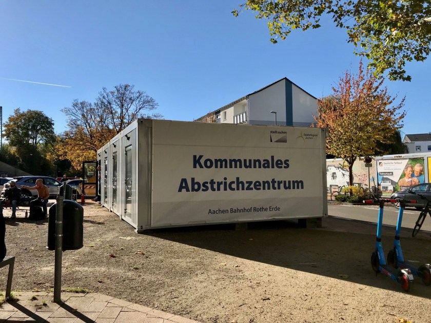 Kommt man aus dem Bahnhof Rothe Erde raus, steht man vor diesem Abstrichzentrum. Dort hat sich die Firma Rapidcare verabschiedet, und das Gesundheitsamt hat die Regie übernommen. Statt zwei Containern sind es jetzt vier. Rapidcare testet unterdessen am anderen Ende der Stadt, auf dem Bendplatz, weiter.
