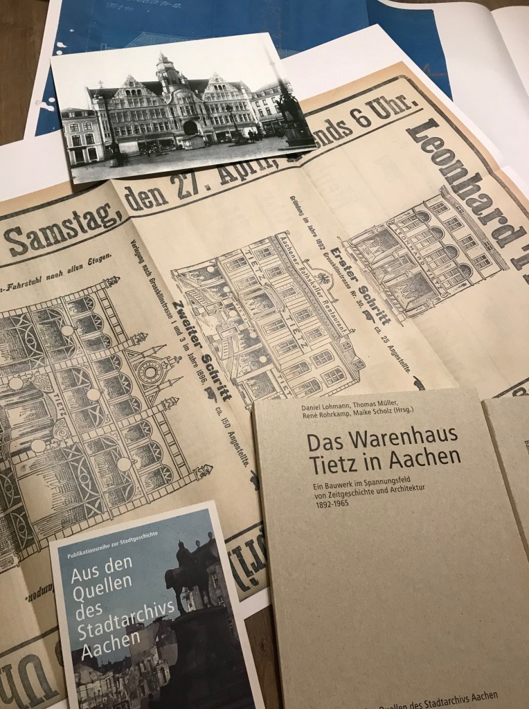 Zum Buch: Daniel Lohmann, Thomas Müller, René Rohrkamp, Maike Scholz (Hrsg.), Das Warenhaus Tietz in Aachen – Ein Bauwerk im Spannungsfeld von Zeitgeschichte und Architektur 1892-1965, ISBN 978-3-00-069326-7. Preis: 25 Euro, erhältlich im Stadtarchiv Aachen, Reichsweg 30. Dort ist eine Anmeldung per Mail (stadtarchiv@mail.aachen.de) oder unter der Telefonnummer 0241-432 4972 erforderlich. Außerdem gibt es das Buch im Aachener Buchhandel, z. B. in der Buchhandlung Backhaus.