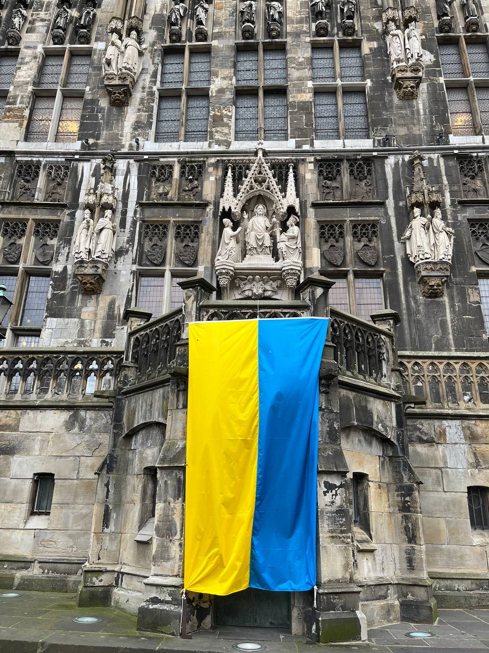 Am morgigen Freitag, 25. Februar, um 17 Uhr trifft man sich am Markt vor dem Rathaus zu einer Solidaritätskundgebung für die Ukraine. Im Anschluss organisieren der Verein Aachener Friedenspreis und Pax Christi um 18 Uhr in der Citykirche (Großkölnstraße) eine Mahnwache mit Friedensgebet.