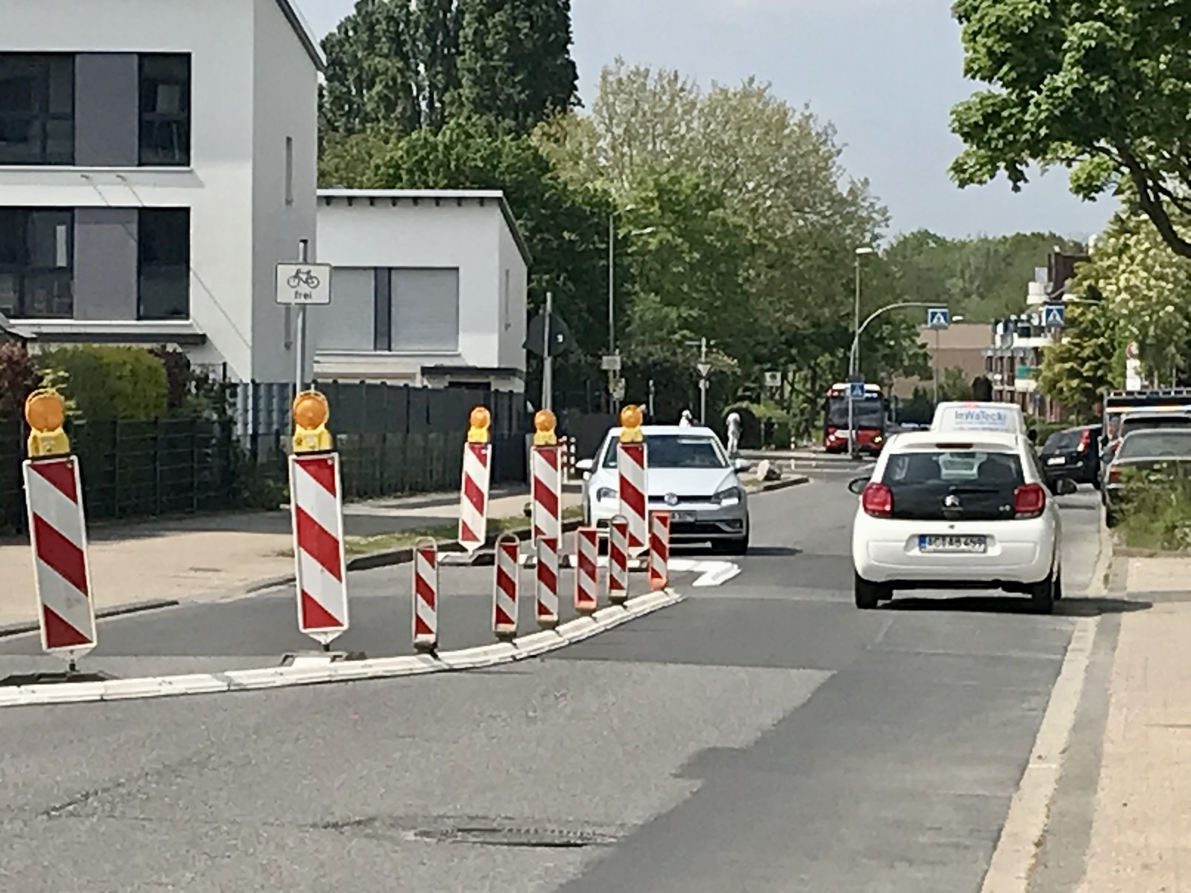 Die Fachverwaltung probiert nun eine Idee im Rahmen eines zweiwöchigen Verkehrsversuchs aus. Er hat heute, Montag, 9. Mai, um 9 Uhr begonnen. Die Fahrbahn der Rombachstraße ist auf Höhe des Vennbahnwegs mit Hilfe von Leitschwellen auf eine Breite von 3,50 Meter eingeengt. Der Kfz-Verkehr kann während der Testphase nur noch einspurig an der Querungsstelle vorbeirollen. Die Verkehrsfachleute der Stadtverwaltung wollen überprüfen, wie sich diese Veränderung auf den Fuß-, Rad- und Kfz-Verkehr auswirkt und ob Rückstaus entstehen.