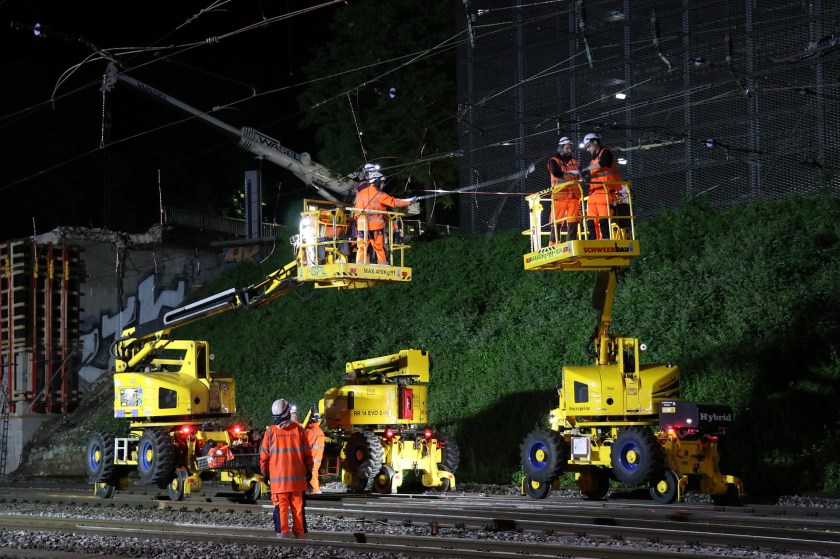 Das andere Material, das zum Schutz des Gleisbetts aufgebracht wurde, wurde ebenfalls stückweise abtransportiert: tonnenweise Schotter, Metallplatten und Holzbalken. Danach haben die Fachleute begonnen, für den Abriss zurückgebauten Oberleitungen wieder herzurichten. Dazu arbeiteten die Oberleitungsmonteure rund um die Uhr, um neue Halteseile und Fahrleitungen einzuziehen.