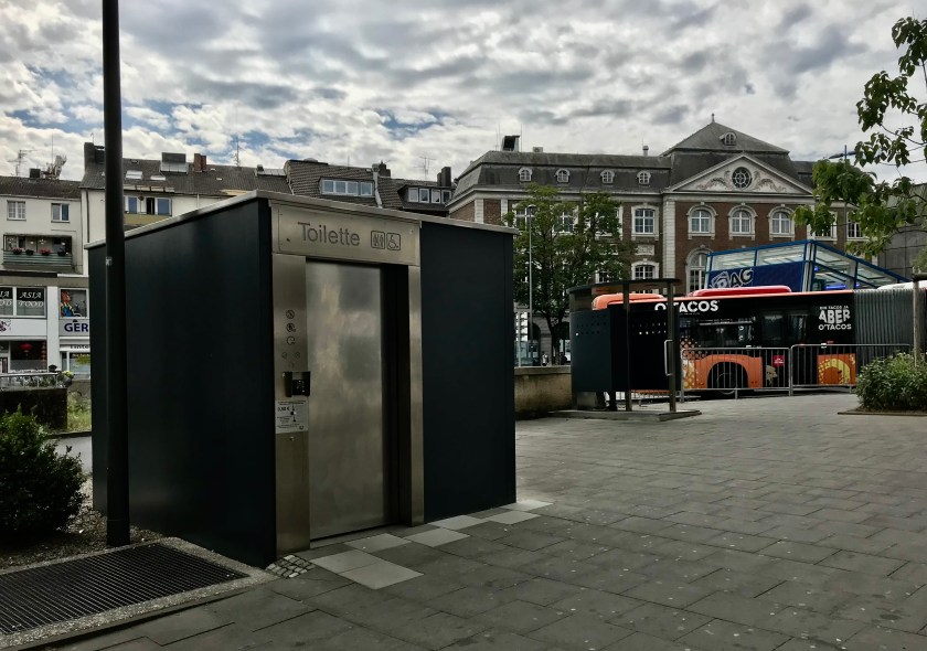 Die Toilette befindet sich seitlich vom Bushof, an der Ecke Kurhausstraße in Nähe der Haltestelle Nummer 10.