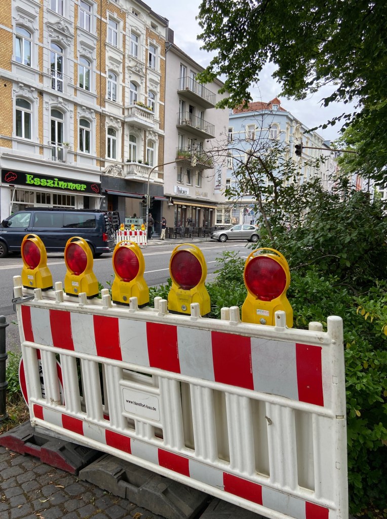 Noch ist sie nicht gesperrt, die Straße zwischen der Gaststätte „Insulaner“ und dem Neumarkt. Die Baken stehen allerdings schon zum Aufstellen bereit. Es wartet an der Bismarckstraße außerdem ein Kamerateam des WDR auf Action. Die Sperrung scheint stadtweit von Interesse zu sein. (Tipp: Um 19.30 Uhr „Aktuelle Stunde“, WDR, einschalten.)