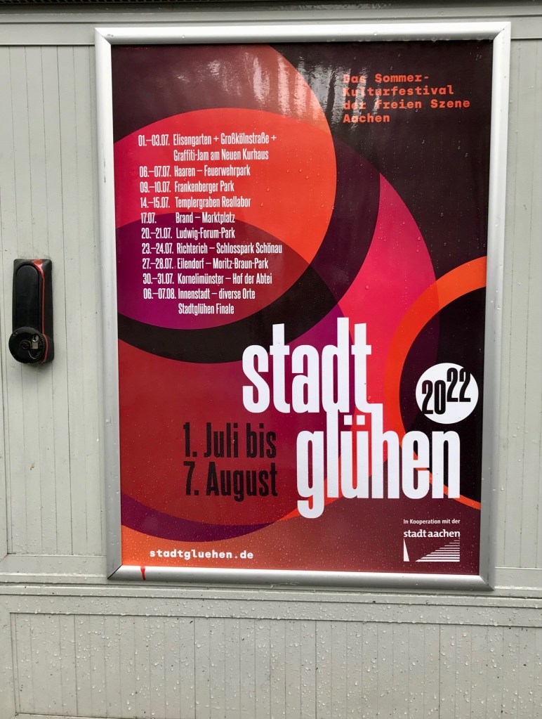 Nach dem – mit einigen Turbulenzen verbundenen – Start im vergangenen Jahr geht das „Stadtglühen“ jetzt in seine nächste Runde. Ab sofort bis zum 7. August wird die freie Aachener Kulturszene wieder Kunst und Kultur „an den unterschiedlichsten Orten in der gesamten Stadt kostenlos erfahr- und erlebbar machen“, teilt die Pressestelle der Stadtverwaltung mit.
