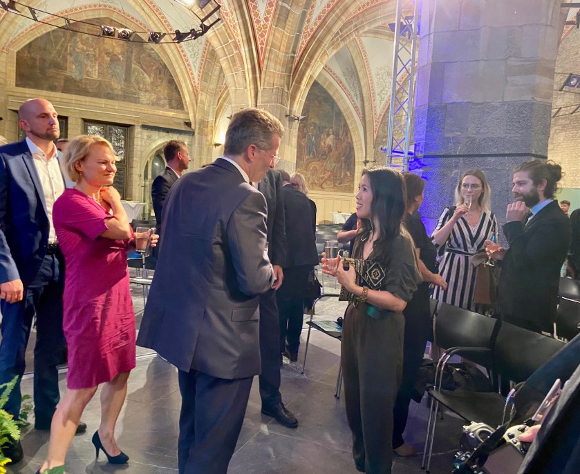 Preisträgerin Mai Thi sprach zum Schluss. Sie stellte sich selbst vor, indem sie Anekdoten aus ihrem Leben erzählte. Auch ihr Vater hat übrigens einst in Aachen Chemie studiert. Ihr Thema war gestern die Informationskrise. Eine Krise sei das, die JEDE andere Krise um ein Vielfaches verstärke. Sie bedauerte, das die Vertreter von Verschwörungserzählungen „in jede Talkshow“ eingeladen werden. Das lasse sich aber nicht ändern, denn Verschwörungserzählungen erregten sehr viel mehr Aufmerksamkeit, bekommen viele Klicks. Das Zugespitzte, das schwarz/weiß Gemalte und Aufregende werde der korrekten Information vorgezogen.