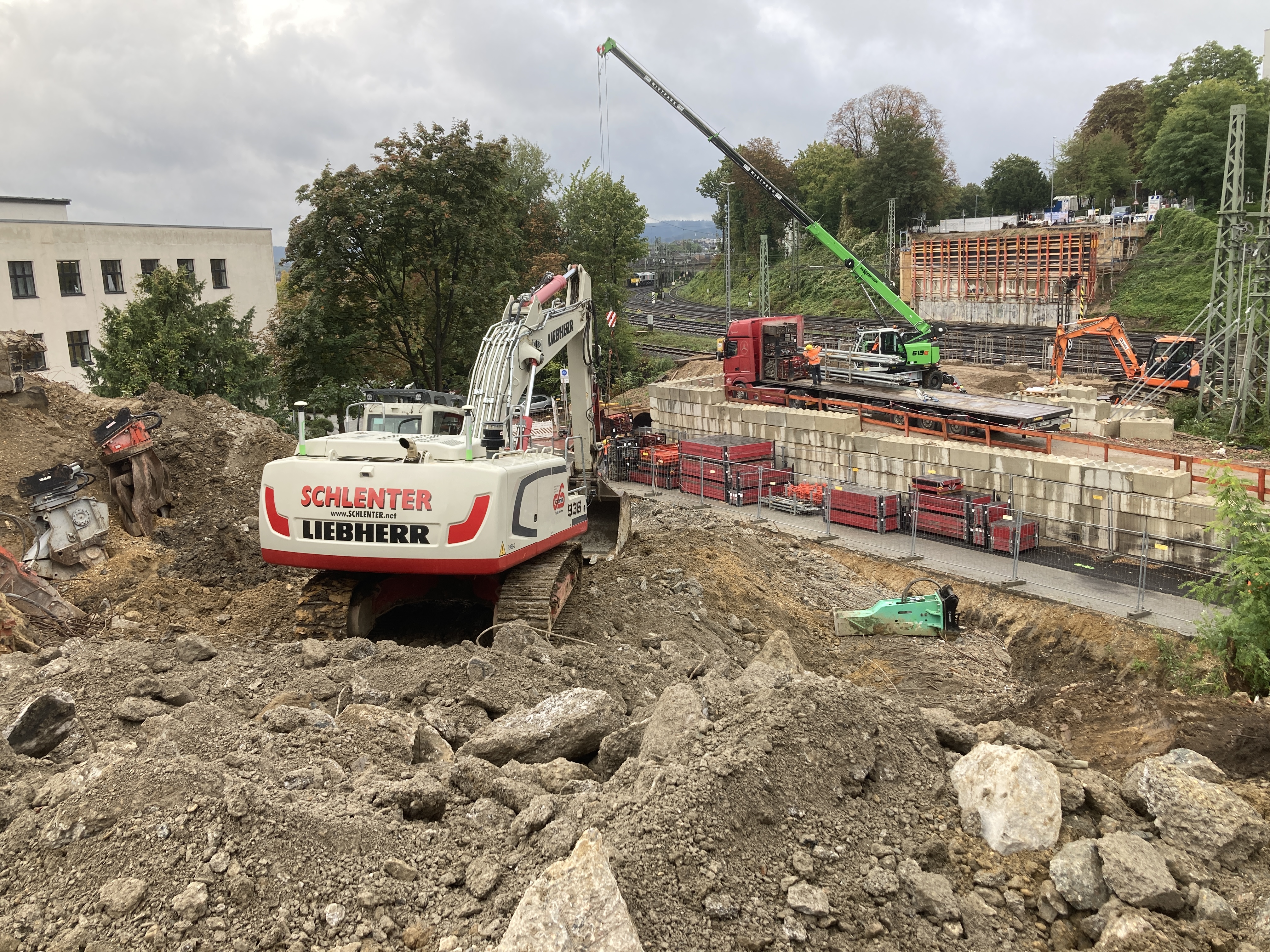 Auch danach ging es, so teilt die Stadtverwaltung mit, für die Beteiligten des Aachener Stadtbetriebs, des Ingenieurbüros Doser, Kempen, Krause und des ausführenden Bauunternehmens Hochtief aufregend weiter: Die beiden Widerlager, auf denen auch die neue Brücke aufliegen wird, mussten teilweise entfernt werden. Das bedeutet, dass Beton stückweise herausgetrennt und abgetragen werden musste, um die Oberleitungen und Schienen der Bahnstrecke nicht zu gefährden.