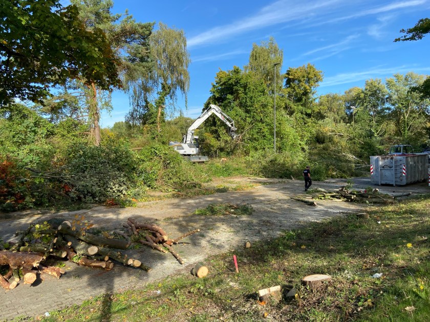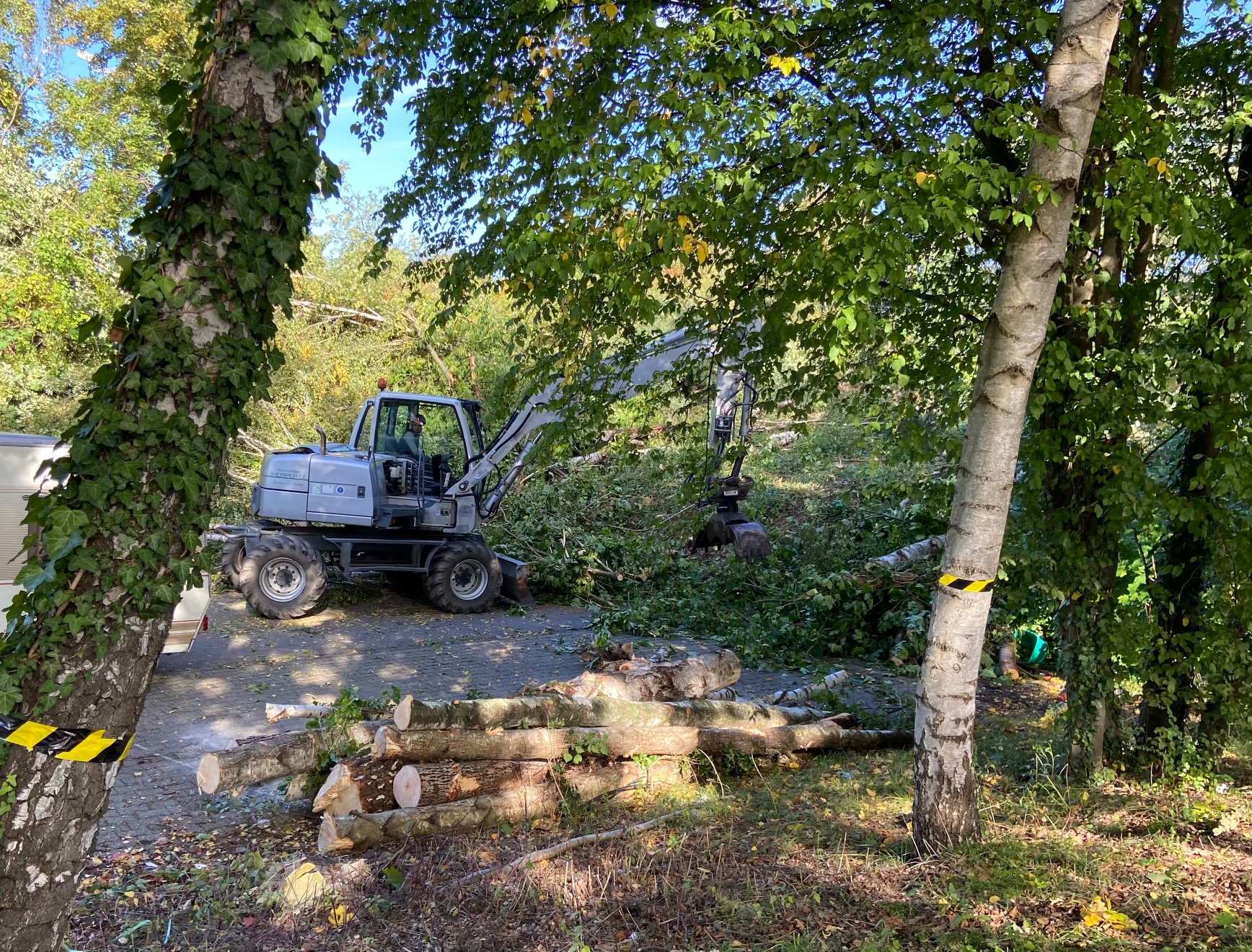 Eine Firma, die sich „Baumpflege“ auf die Lkw geschrieben hat, ist seit heute morgen zugange. Und bis gegen 16 Uhr lagen schon etliche Bäume auf dem Parkplatz, auf dem demnächst das Parkhaus errichtet wird. Von Baumschützern und Aktivisten übrigens weit und breit keine Spur.