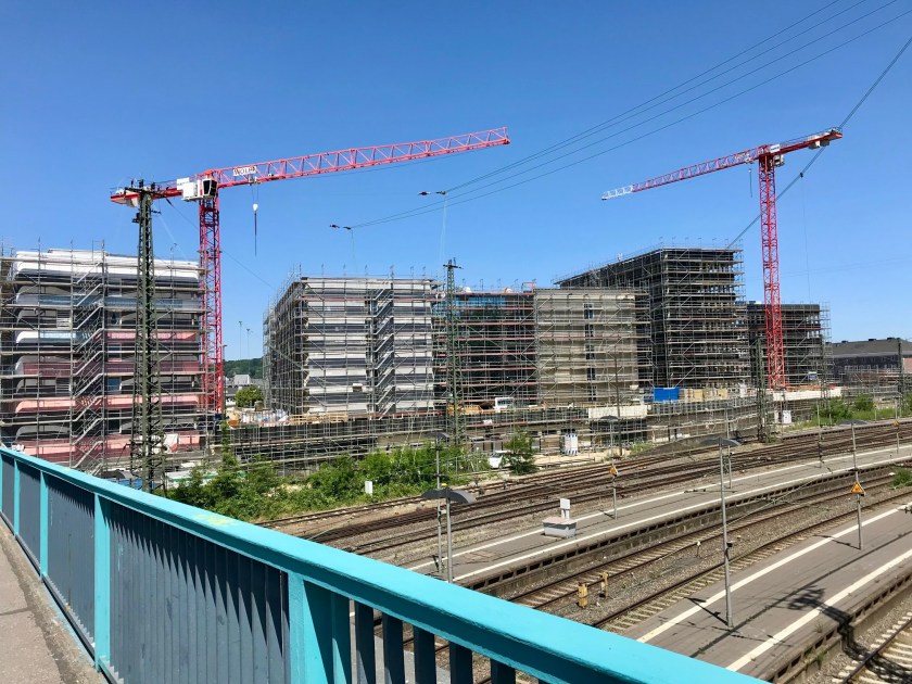 Erst diese Woche haben wir von der Insolvenz des Generalunternehmers Harfid GmbH erfahren. Angeblich ruht der Baubetrieb. Blue Gate, das sind 300 Appartements für Studierende, ein Hotel, Geschäfte, Büros und Gastronomie. Alles wird nicht – wie geplant – dieses Jahr noch fertig, sondern erst im Herbst 2023. Hoffentlich. Das gigantische Bauvorhaben war bisher schon mehrfach in Schwierigkeiten geraten. Zum Weiterlesen: Großbaustelle am Hauptbahnhof.